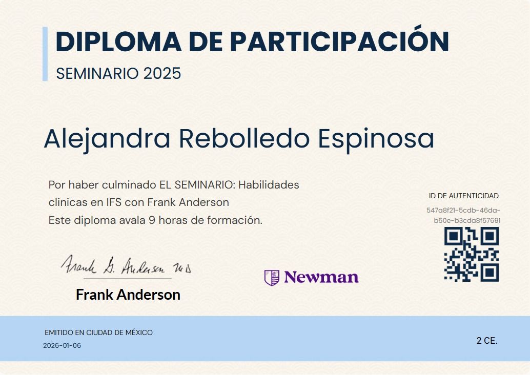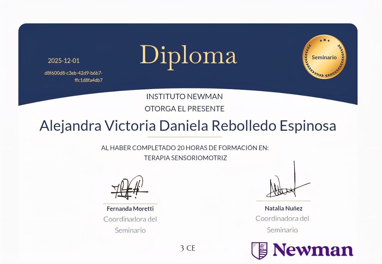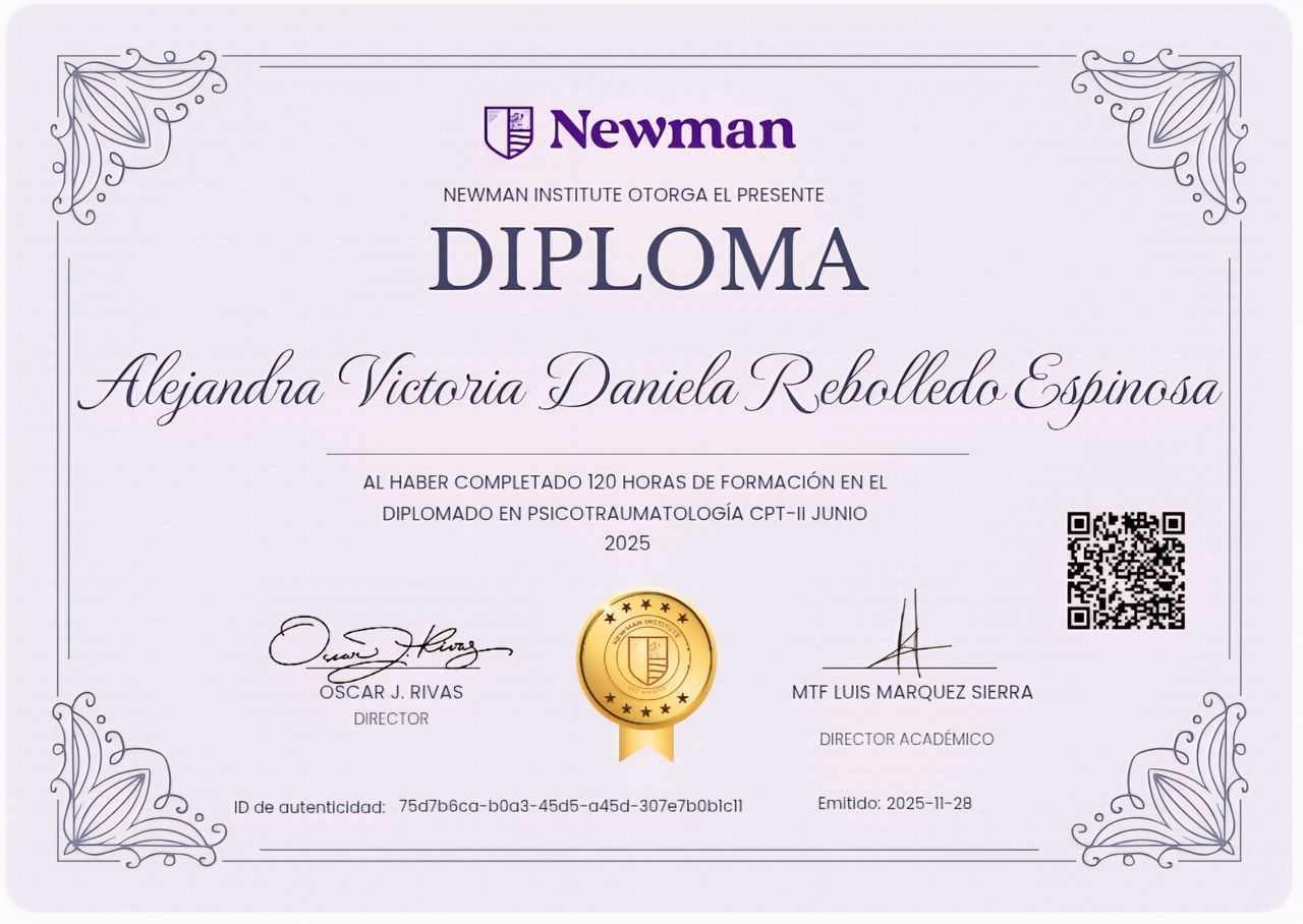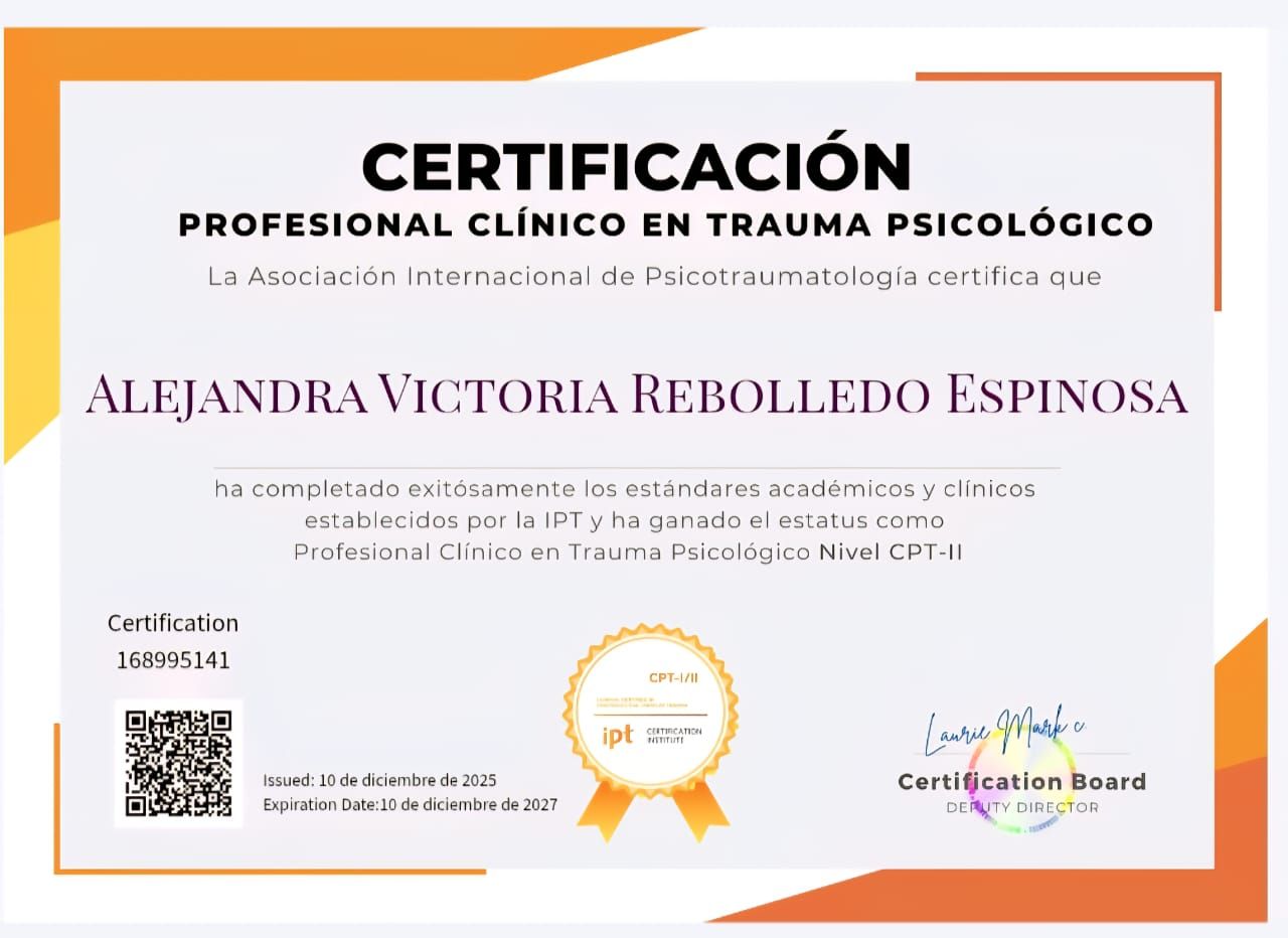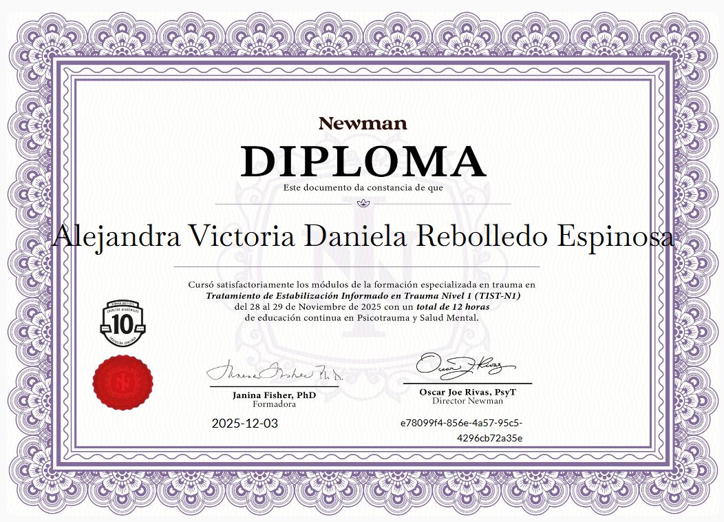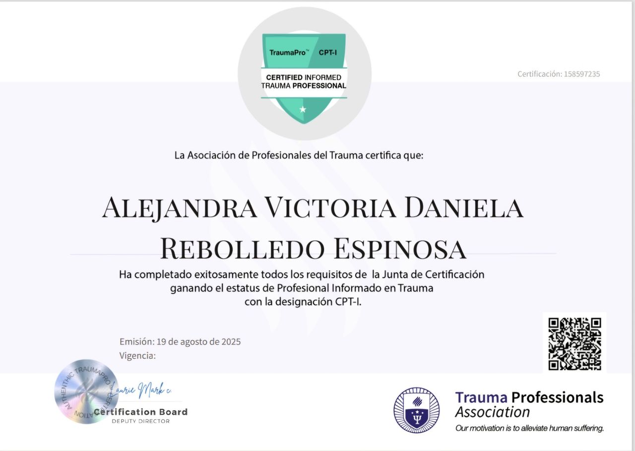 Cuento con formación internacional en psicotraumatología, estoy certificada como profesional informada en trauma CPT-I, evaluación neurodivergente (ADI-R), intervención social (PEERS) y modelos de desarrollo como D.I.R. Floortime. Además, cuento con formación en diferentes trastornos o abordajes clínicos, que puedes revisar en mi información profesional.