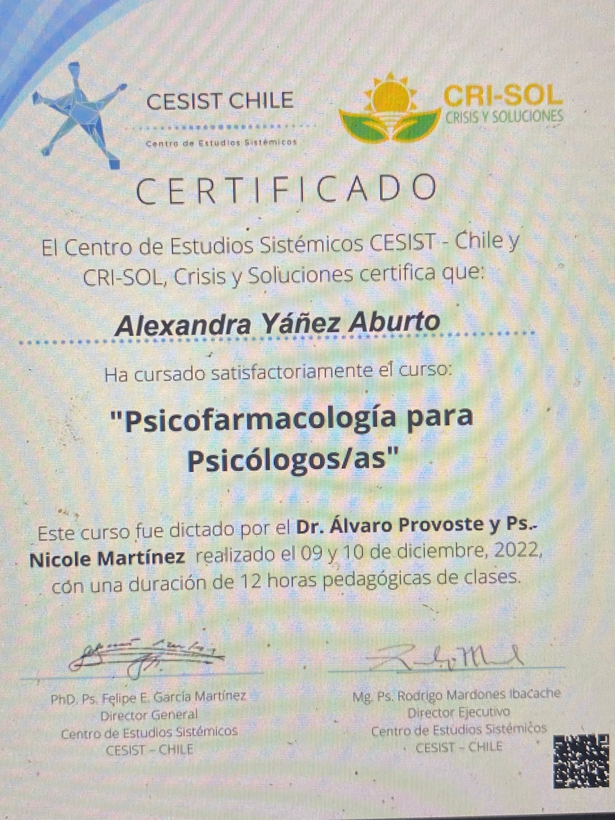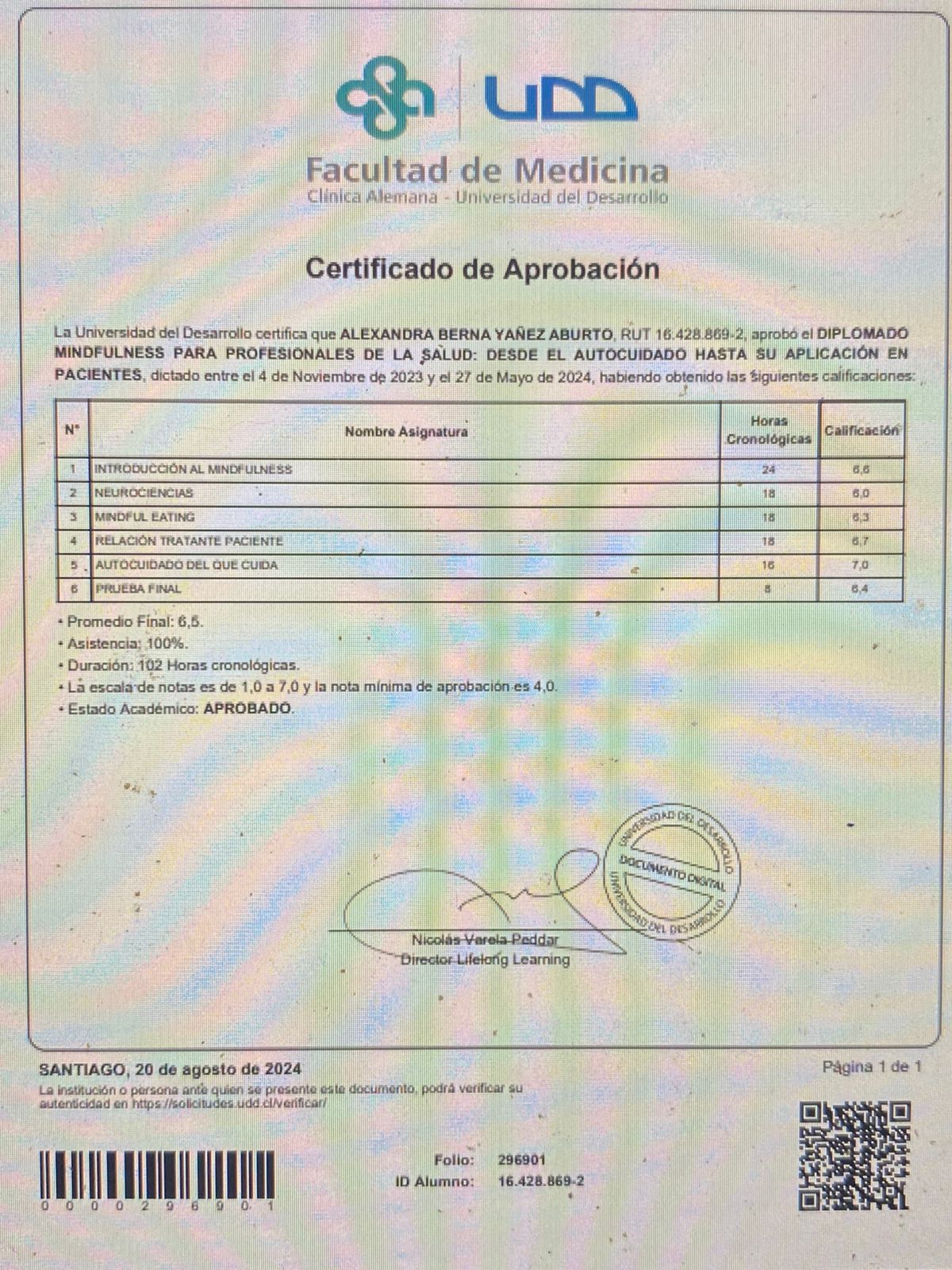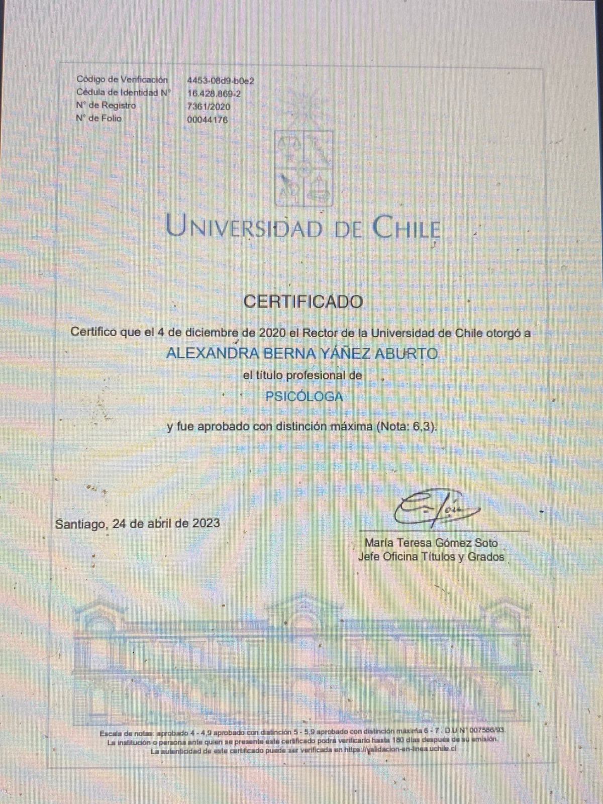Alexandra es una psicóloga dedicada y empática. Yo estaba buscando ayuda puntual para mejorar algunos aspectos. Alexandra me acompaño en preguntas que yo traía, pero también la psicoterapia me permitió explorar otros temas que Alexandra guío con atención y cuidado. Excelente profesional!