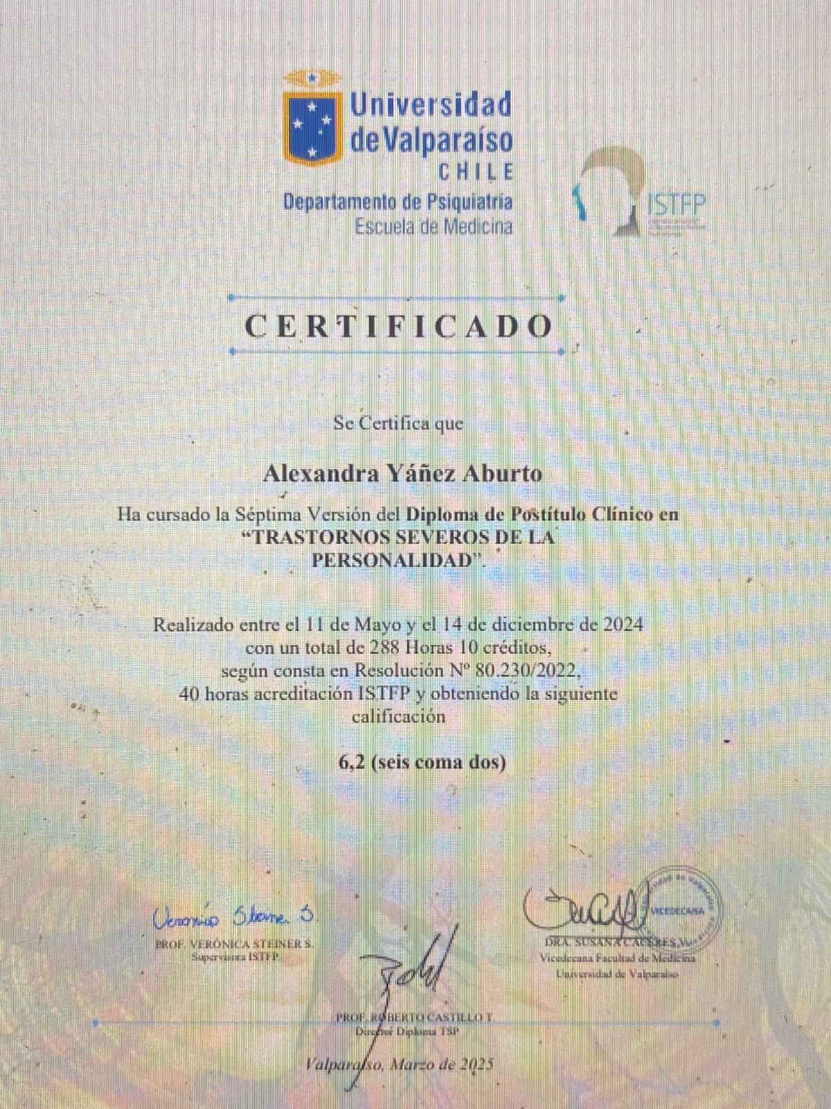 Actualmente curso el Máster en Psicoterapia de Tercera Generación en la Universidad Internacional de La Rioja (UNIR), que integra formación teórica, técnica y supervisión clínica especializada. Integrando enfoques cognitivos conductuales como DBT y ACT además de modelos basados en evidencia como MBT, TFP, EMDR y mindfulness.