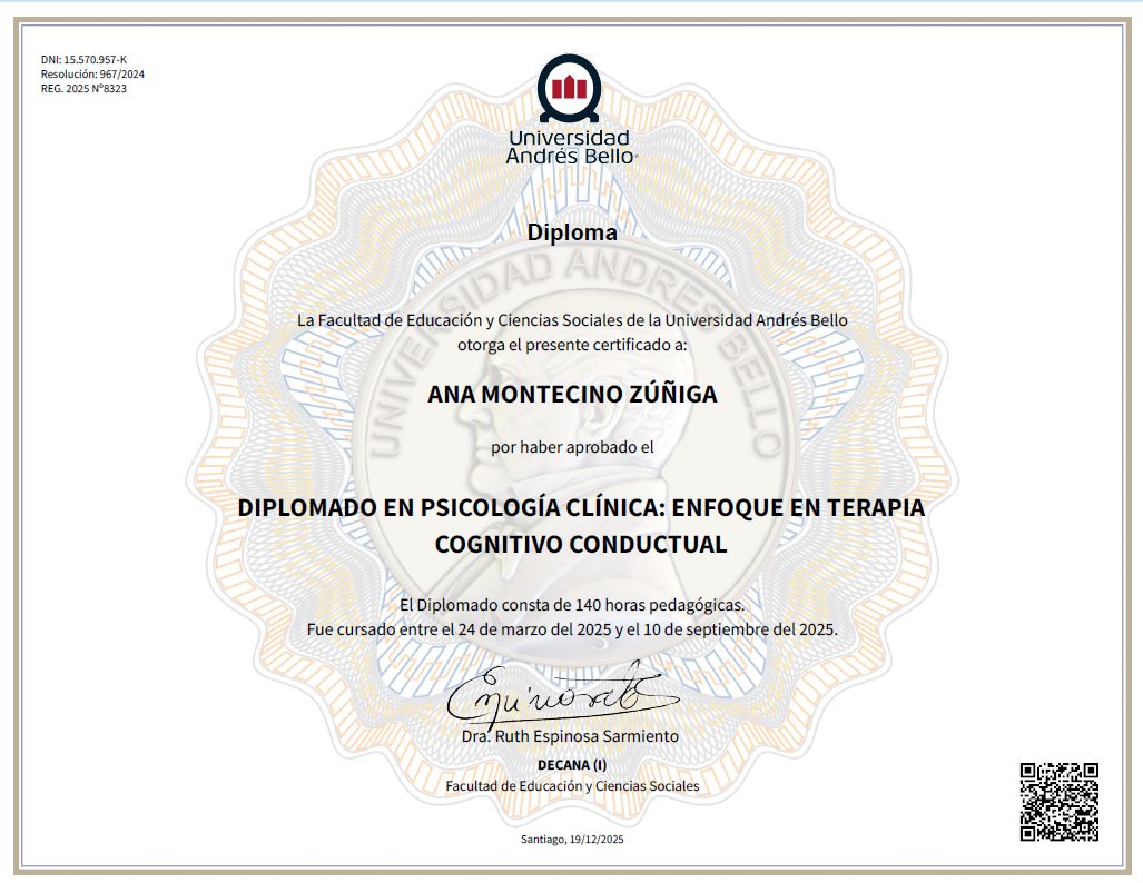 Soy psicóloga clínica con enfoque en Terapia Cognitivo-Conductual (TCC) y diplomada en Salud Mental, con una trayectoria enfocada en el acompañamiento terapéutico de niños, niñas, adolescentes y adultos. Además, soy profesora general básica con postítulo en discapacidad intelectual, lo que me ha permitido integrar una mirada educativa y comprensiva del desarrollo humano a lo largo de todo el ciclo vital.
