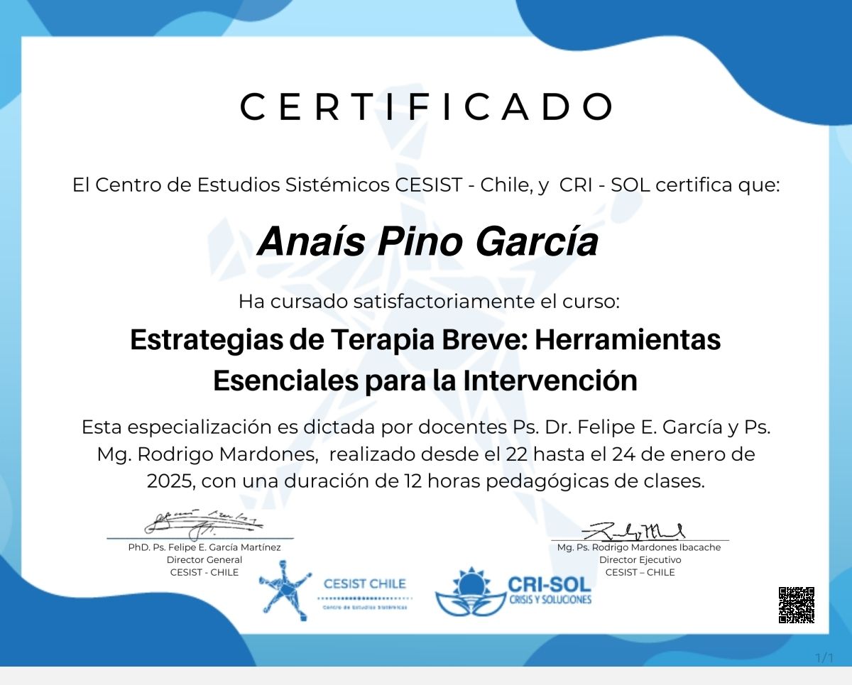 Actualmente curso el Máster en Terapia Breve Estratégica, modelo Giorgio Nardone, en la sede oficial en Chile del Centro de Terapia Breve Estratégica de Arezzo, Italia.