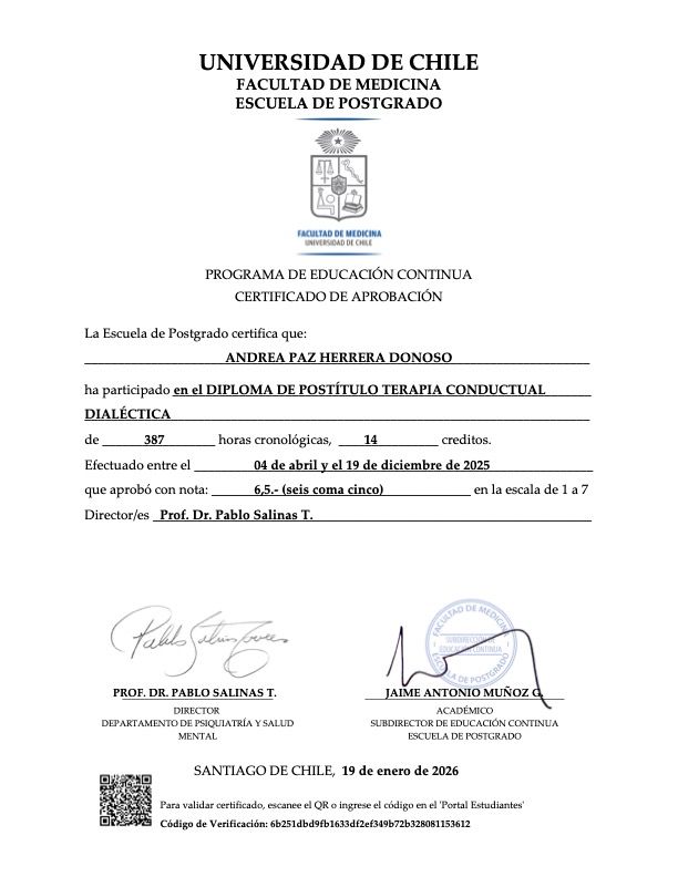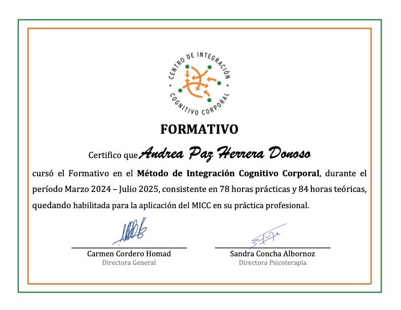 Durante su etapa universitaria profundizó en diversas áreas vinculadas a la salud mental, entre ellas neurociencias, sexualidad, bienestar, sueño, autocuidado, emociones, mindfulness, envejecimiento y filosofía. Posteriormente cursó el Diplomado de Postítulo en Terapia Dialéctico Conductual (DBT) en la Universidad de Chile, se formó en el Método de Integración Cognitivo Corporal (MICC) y obtuvo la certificación como Coach Ontológico en Newfield Consulting, ampliando así su mirada clínica hacia un enfoque integrador que considera pensamiento, emoción, cuerpo, relaciones y lenguaje.