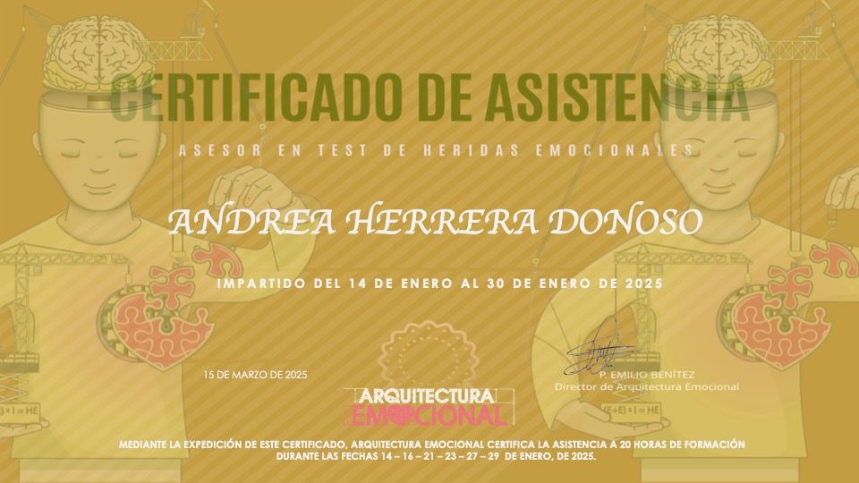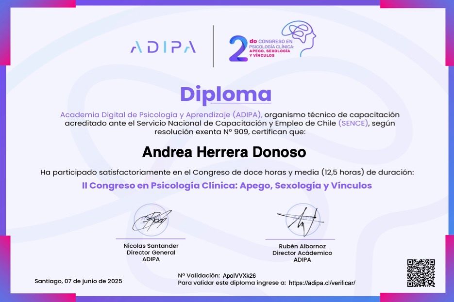 Actualmente curso el Diplomado en Terapia Dialéctico Conductual (DBT) en la Universidad de Chile y el Postítulo en Coaching Ontológico en Newfield, además de haber realizado la formación en el Método de Integración Cognitivo Corporal (MICC). He complementado mi desarrollo con certificaciones nacionales e internacionales en áreas como neurociencia, bienestar, filosofía y sexualidad.