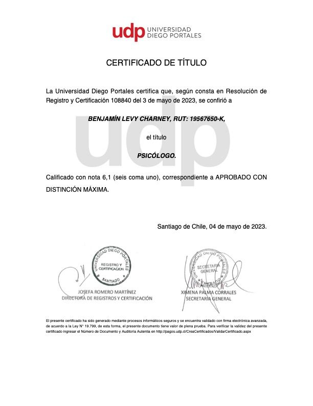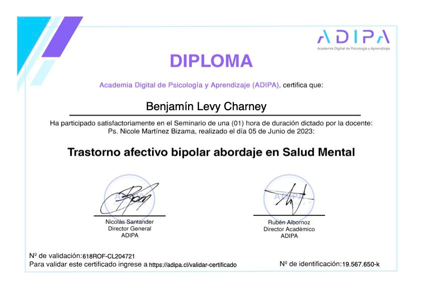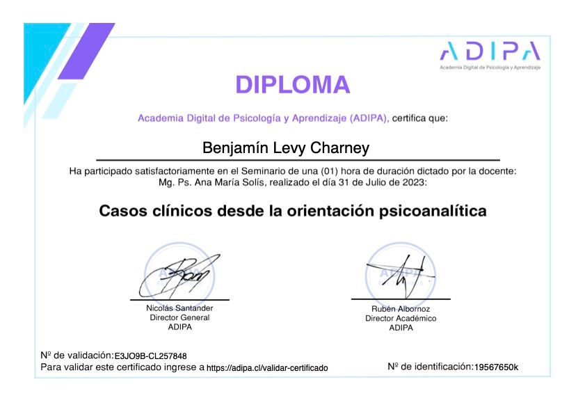 Conozco a Benjamín profesional y personalmente. Sin lugar a dudas es un psicólogo que posee muchísima dedicación y formación en el área clínica. Es una persona muy cálida, cercana y comprensiva en su trato, orientándose constantemente hacia el bienestar de su paciente. Totalmente recomendado