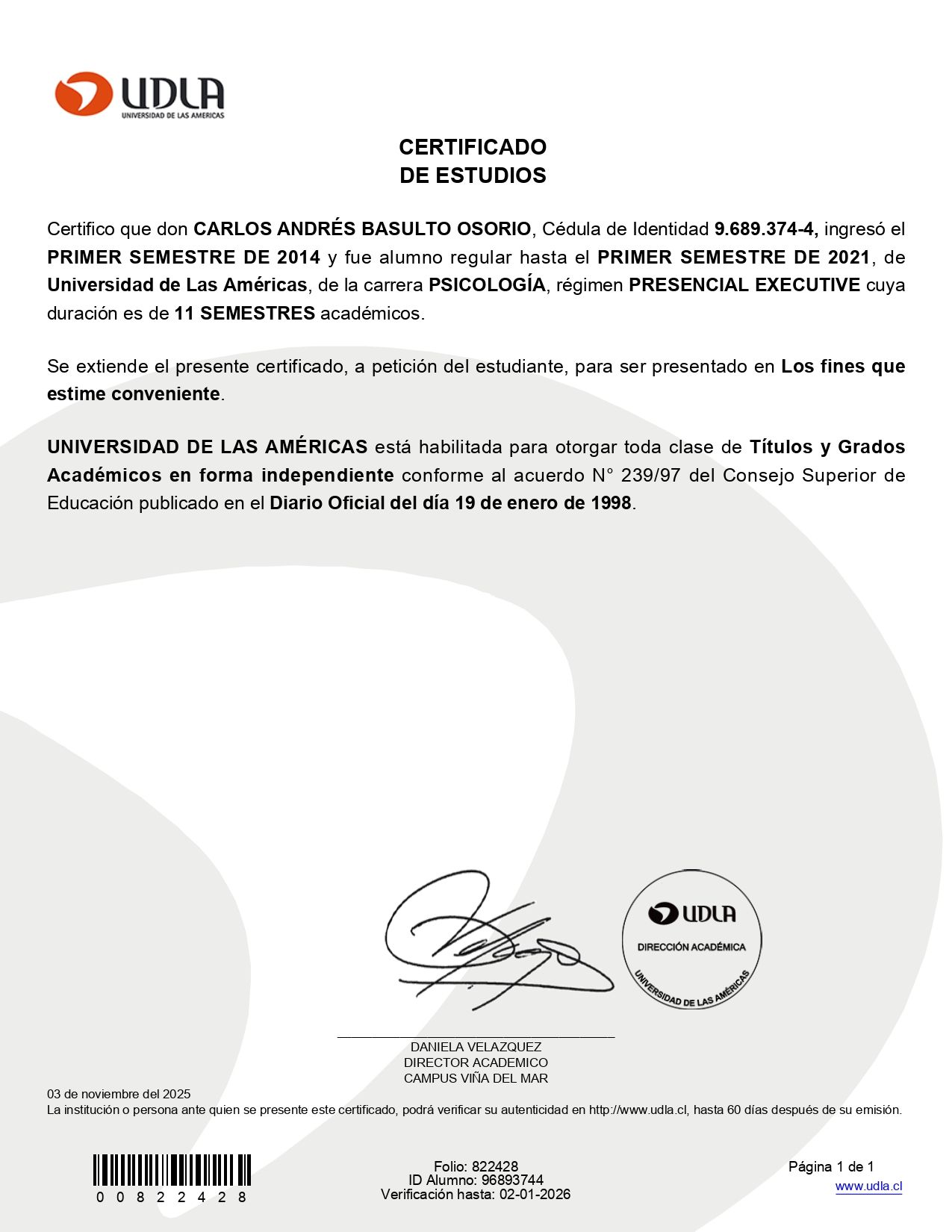 Me ha ayudado gradualmente a ser la persona que quería ser, en un proceso que si bien no está terminado, los avances se ven y se sienten, por lo que me seguiría atendiendo con Carlos. Siempre puntual, cordial, comprensivo y paciente, un excelente profesional