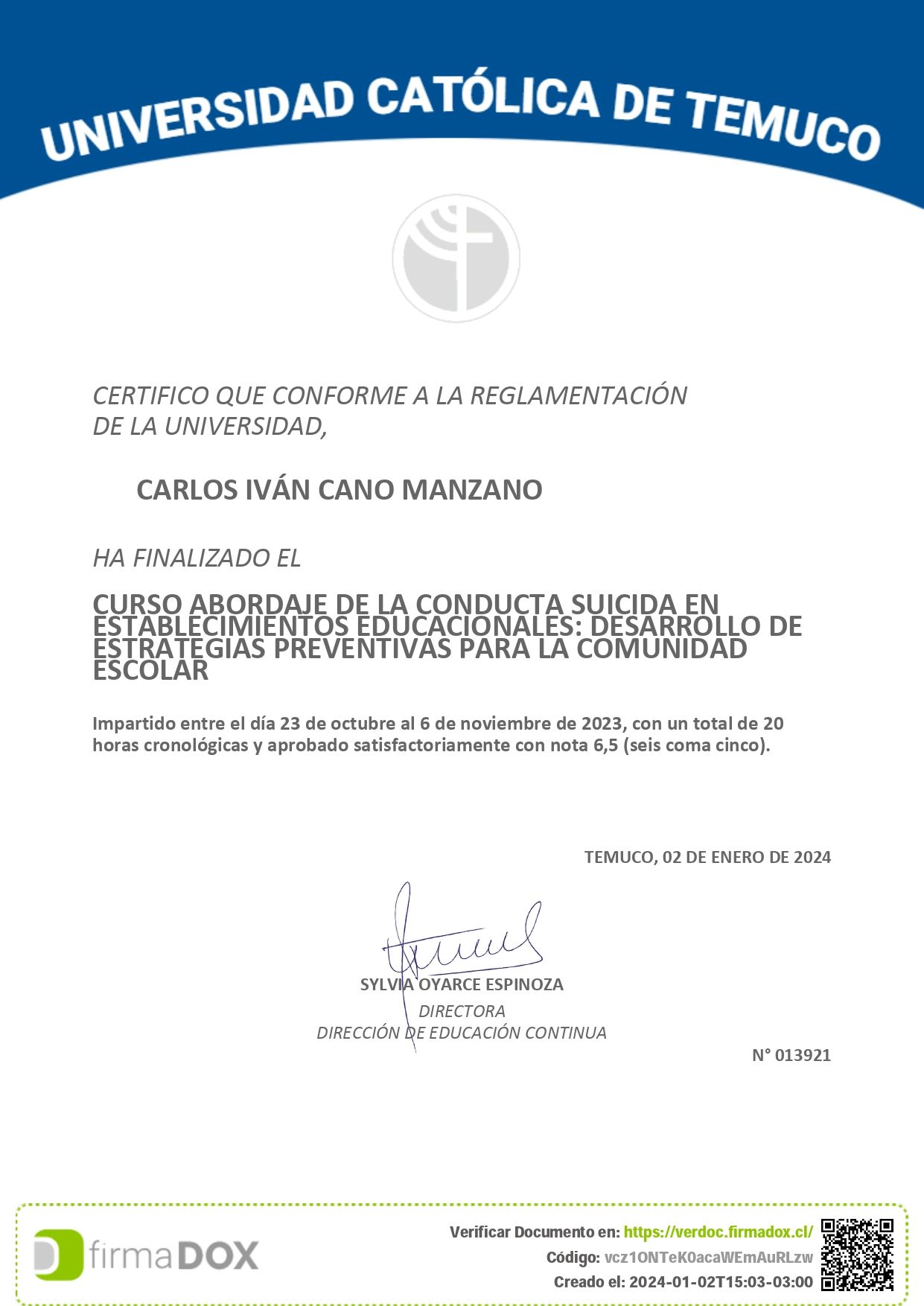 Hola, soy Carlos Cano Manzano, psicólogo clínico con experiencia en el acompañamiento terapéutico de niños, adolescentes y adultos, además de la redacción de informes psicodiagnósticos (para diversos fines), toma de prueba WISC-V (realización del informe correspondiente), intervenciones grupales y procesos psicoeducativos. Atiendo pacientes particulares y con FONASA, a través de bono ($10.300). Mi trabajo se centra en brindar un espacio seguro y empático, donde puedas explorar tus emociones, comprender tus patrones de pensamiento y encontrar nuevas formas de relacionarte contigo mismo/a y con los demás.