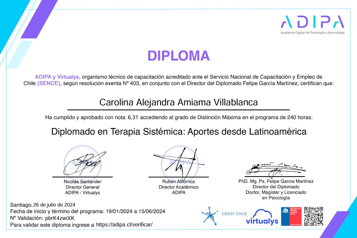 Hola a todos, mi nombre es Carolina Amiama, psicóloga de profesión con 10 años de experiencia. Postítulo en investigación psicológica forense. Facultad de ciencias sociales Universidad de Chile. Diplomado en Terapia Sistémica Breve. Realizó psicoterapia Online a Adultos y adolescentes. Al término de la sesión se envía boleta, para posterior reembolso.