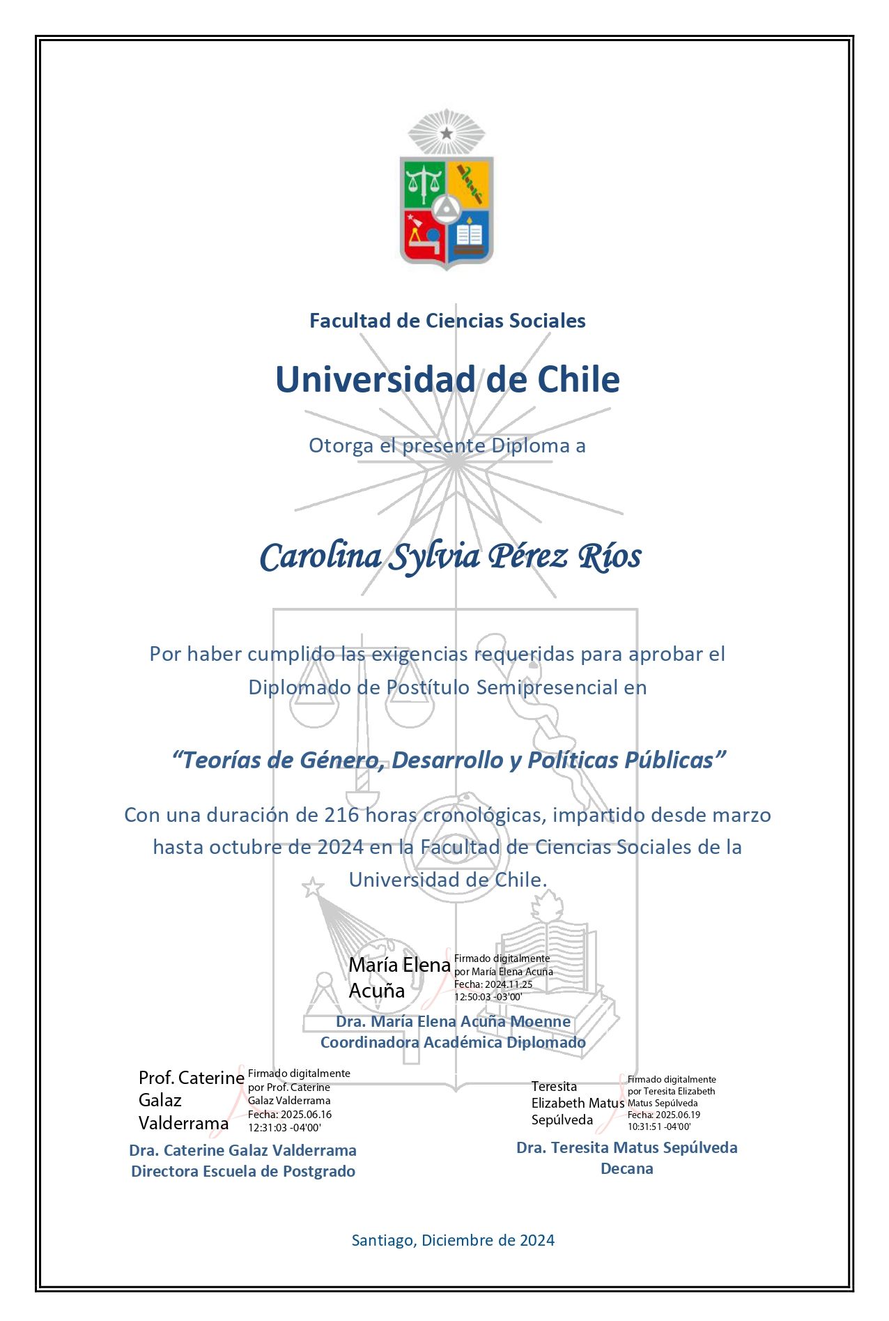 Cuento con un diplomado en "Teorías de género, desarrollo y políticas públicas" de la Facultad de Ciencias Sociales, Universidad de Chile (2024) y "Género, diversidad e inclusión", Escuela Matriztica (2024 y 2025, respectivamente)