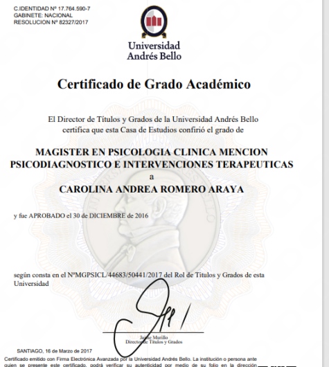 Poseo un magister en psicodiagnóstico e intervenciones terapéuticas, soy diplomada en duelo gestacional, perinatal y gestación arcoíris, ademas soy instructora de yoga para la niñez y la pre adolescencia.
