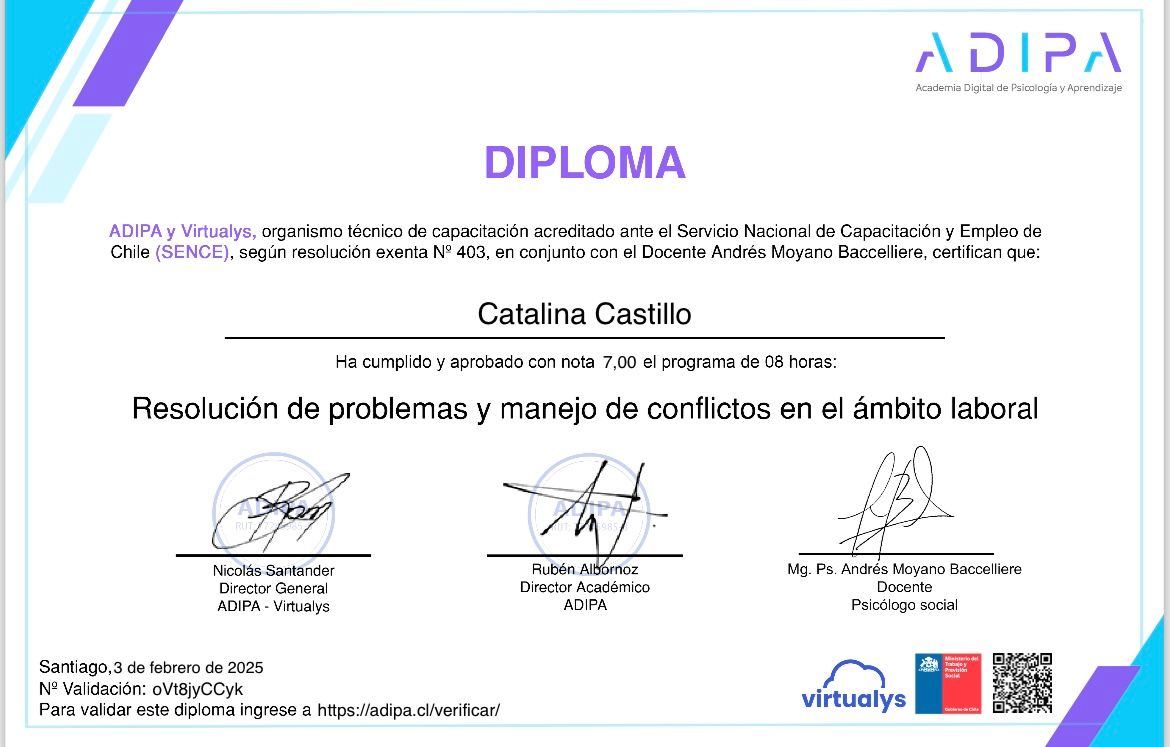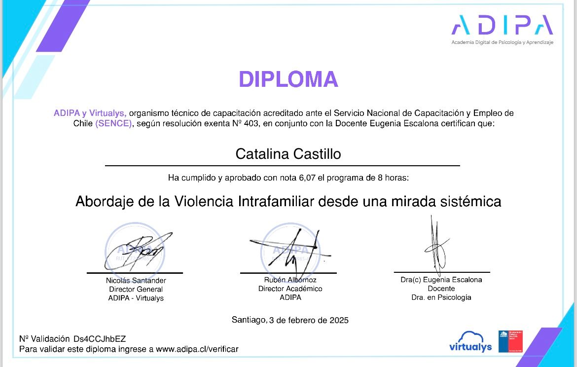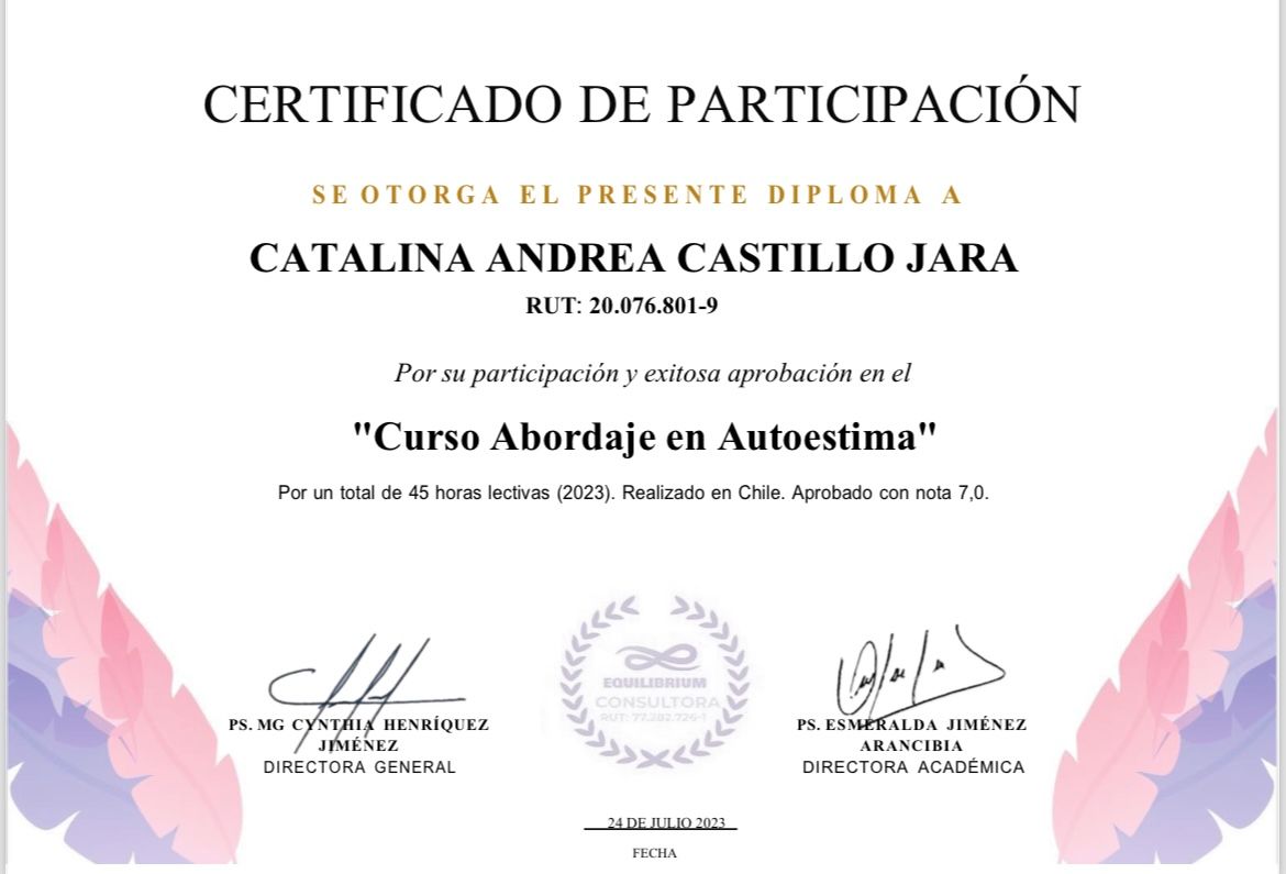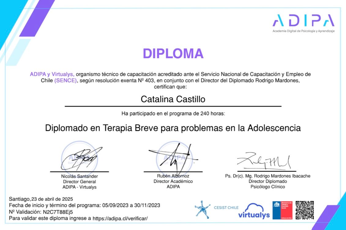 Hola! Soy Catalina Castillo, psicóloga clínica y atiendo de forma presencial en Concepción, así como también de manera online para quienes se encuentren en otras ciudades. Trabajo con adolescentes y adultos, acompañando distintas etapas del ciclo vital y diversas problemáticas emocionales. Tengo experiencia en el tratamiento de trastornos del ánimo, ansiedad, trastornos de personalidad, y dificultades relacionales. Cuento con un diplomado en terapia breve para problemáticas en la adolescencia, y también abordo temáticas como autoestima, manejo de emociones, duelo, violencia intrafamiliar, proceso de separación, crisis personales, entre otras temáticas de salud mental. Mi enfoque es integrativo, combinando herramientas de la psicoterapia sistémica y psicodinámica. Esto me permite adaptar cada proceso terapéutico a las necesidades únicas de cada persona, con respeto, calidez y compromiso. Si estás pasando por un momento difícil, si notas que tu hijo o hija necesita apoyo, o si simplemente sientes que algo no está en equilibrio, te invito a conversar. Juntos/as podemos trabajar en un espacio seguro, cercano y pensado para ti.