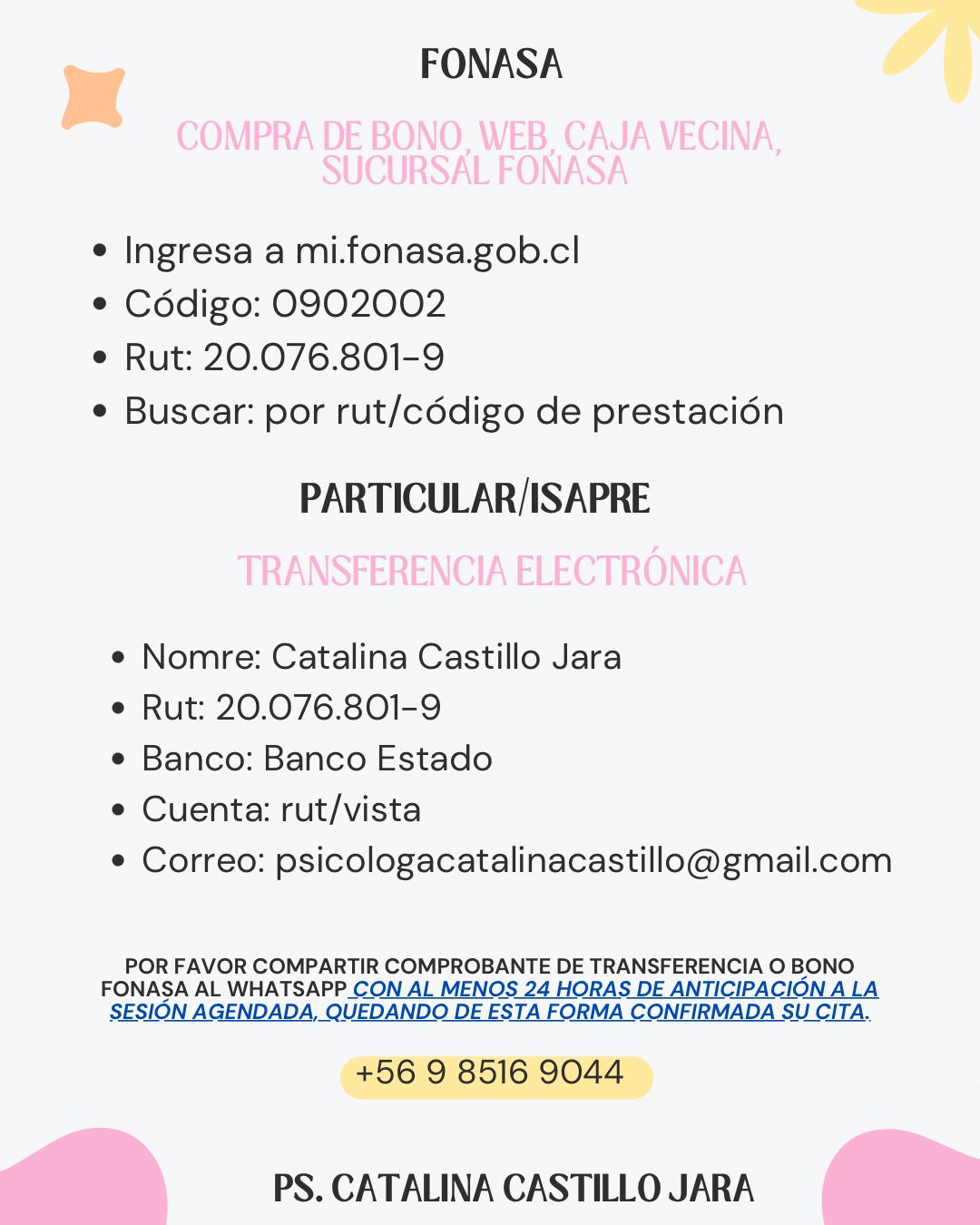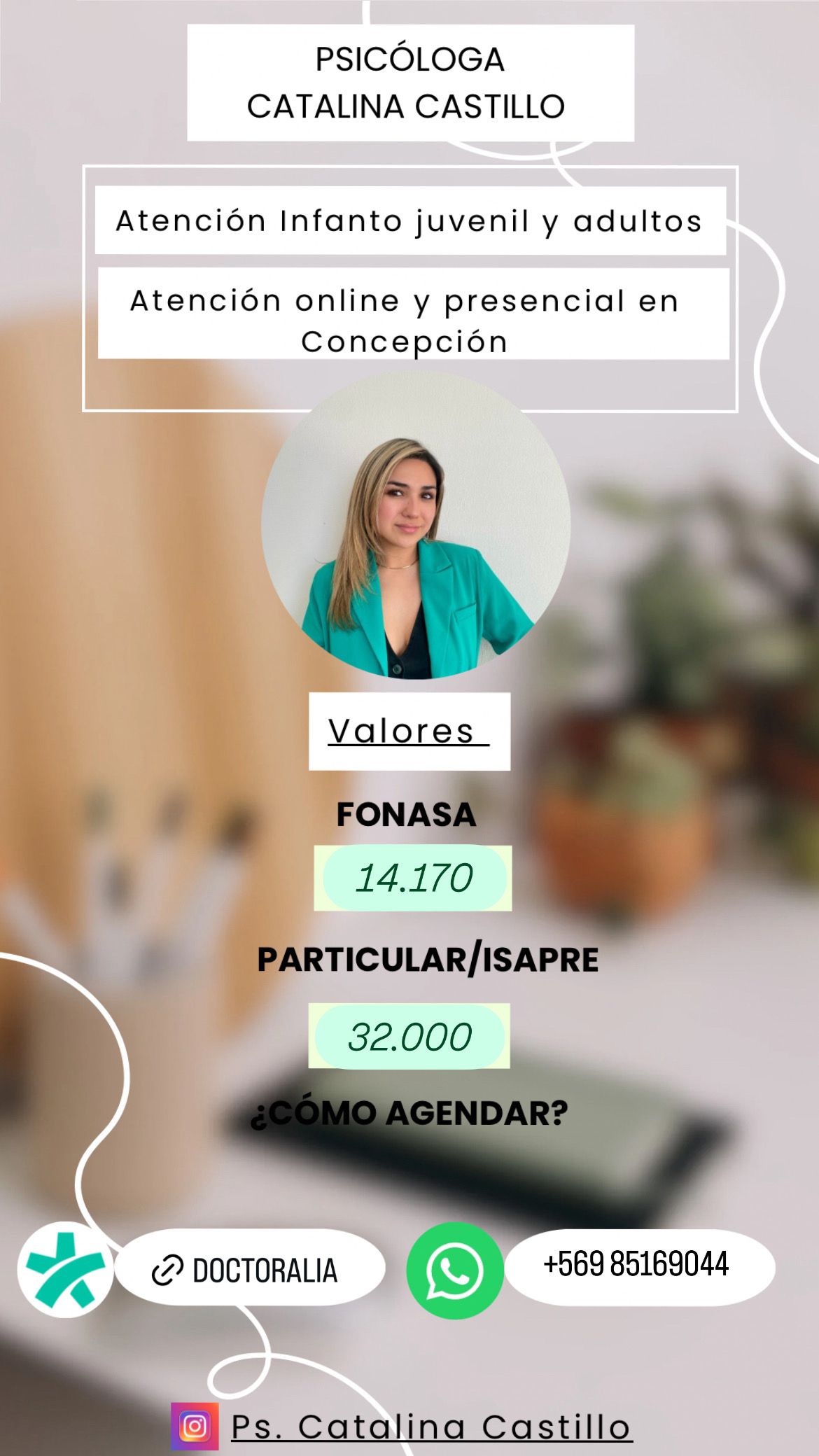 Hola! Soy Catalina Castillo, psicóloga clínica y atiendo de forma presencial en Concepción, así como también de manera online para quienes se encuentren en otras ciudades. Trabajo con adolescentes y adultos, acompañando distintas etapas del ciclo vital y diversas problemáticas emocionales. Tengo experiencia en el tratamiento de trastornos del ánimo, ansiedad, trastornos de personalidad, y dificultades relacionales. Cuento con un diplomado en terapia breve para problemáticas en la adolescencia, y también abordo temáticas como autoestima, manejo de emociones, duelo, violencia intrafamiliar, proceso de separación, crisis personales, entre otras temáticas de salud mental. Mi enfoque es integrativo, combinando herramientas de la psicoterapia sistémica, cognitivo conductual y psicodinámica. Esto me permite adaptar cada proceso terapéutico a las necesidades únicas de cada persona, con respeto, calidez y compromiso. Si estás pasando por un momento difícil, si notas que tu hijo o hija necesita apoyo, o si simplemente sientes que algo no está en equilibrio, te invito a conversar. Juntos/as podemos trabajar en un espacio seguro, cercano y pensado para ti.