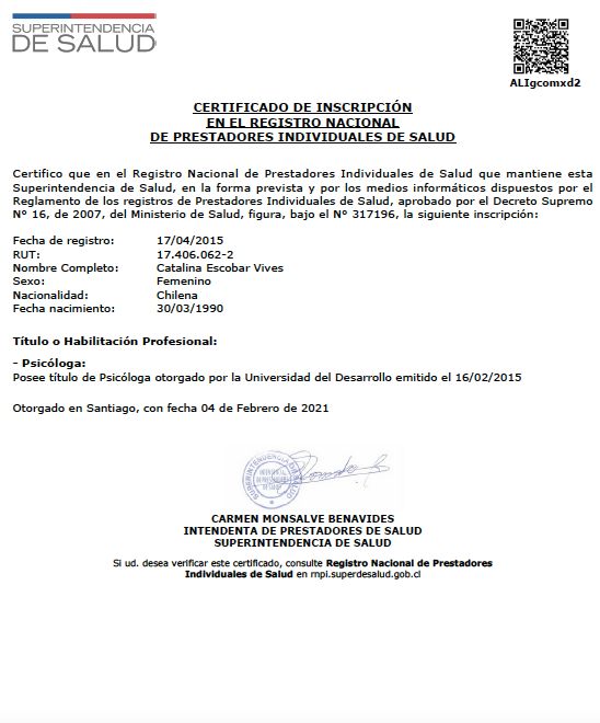 Mi experiencia en terapia con Cata fue muy bonita y enriquecedora. Ella es una persona muy especial, cálida y cercana. Terapia con ella me sirvió para reflexionar profundamente de mi vida para comenzar a construir una vida más alineada a mí misma. Me ayudó a cruzar barreras y creer en mi. Estoy muy orgullosa de lo logrado y muy agradecida de su compañía en el proceso.