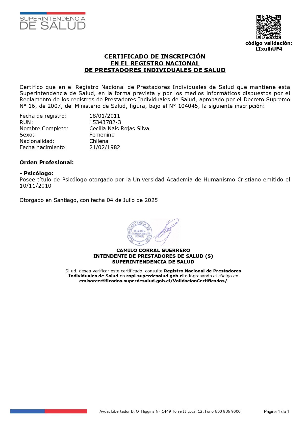 Soy Cecilia Rojas, Psicóloga con más de 15 años de experiencia, en instituciones de salud, de educación y de gestión pública. Durante el desarrollo de mi carrera, he ido perfeccionando mis conocimientos en la comprensión de las problemáticas de adolescentes y la interacción de estos con sus desafíos. Comprendo, que cada etapa de la vida presenta dificultades y exigencias que con empatía y entendimiento propio, se puede generar modificaciones en nuestro pensamiento y mejoras en nuestro bienestar.