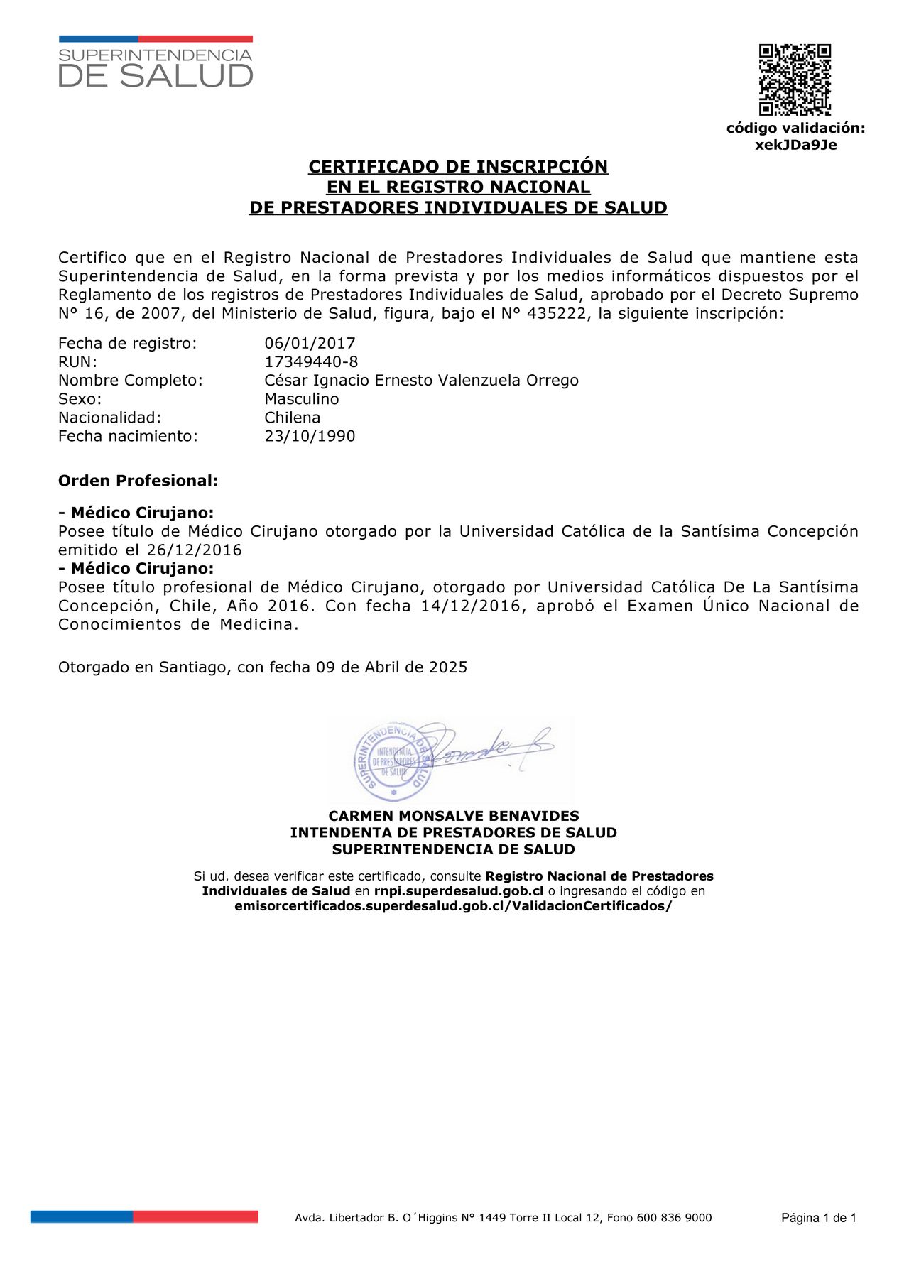 Tuve la fortuna de ser atendida por el dr César Valenzuela, profesional altamente competente, quien destaca por su calidad humana y compromiso con sus pacientes,