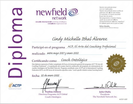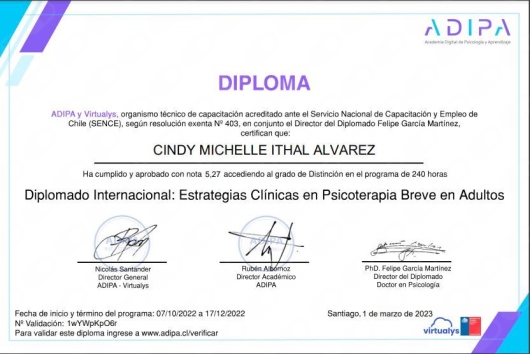 Soy Cindy Ithal Álvarez, Psicóloga Clínica con enfoque cognitivo-conductual, con Diplomado Internacional en Estrategias Clínicas de Psicoterapia Breve en Adultos y Diplomado en Técnicas de Psicodiagnóstico y Competencias Laborales, además de formación Certificada como Coach Ontológica.