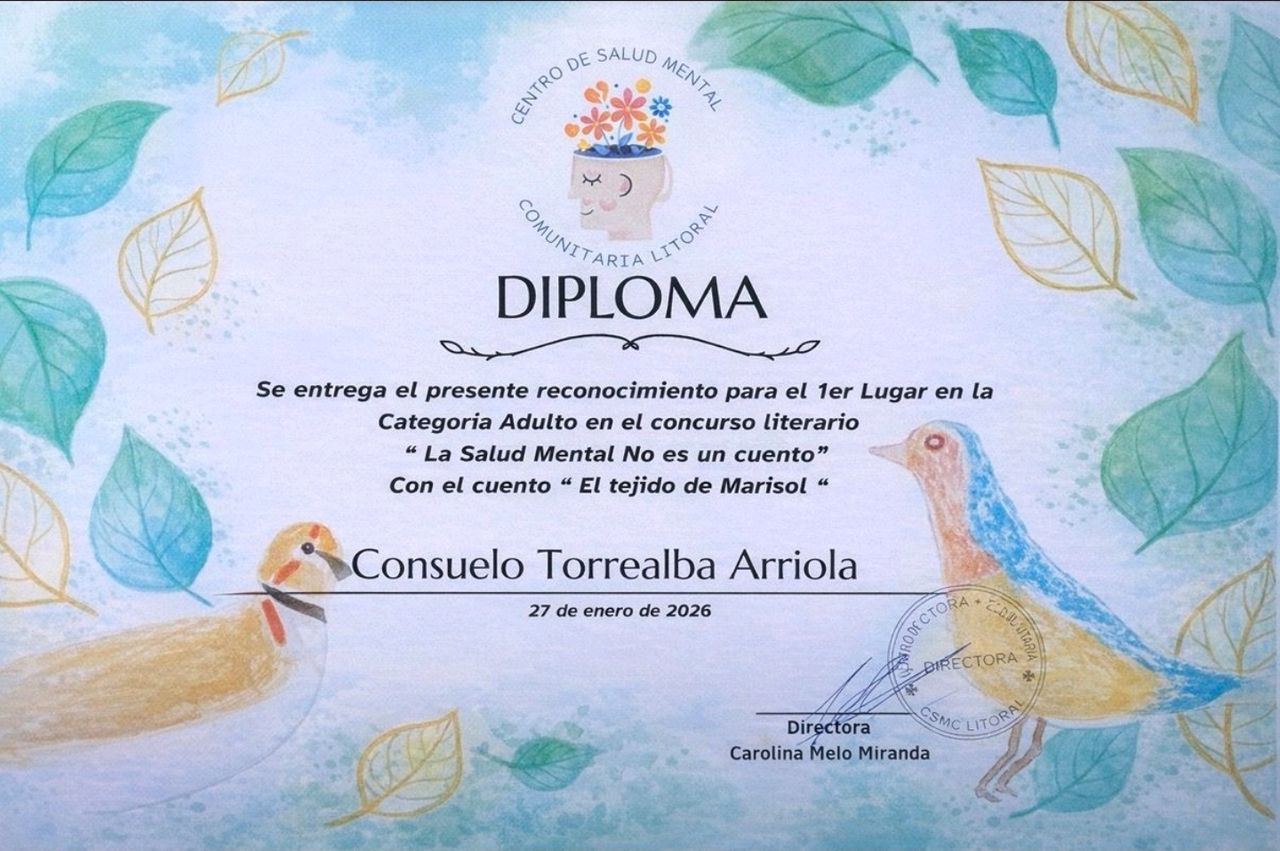 1° lugar en Concurso Literario "La Salud Mental No es un Cuento". En Centro de Salud Mental Comunitaria Litoral. 2026