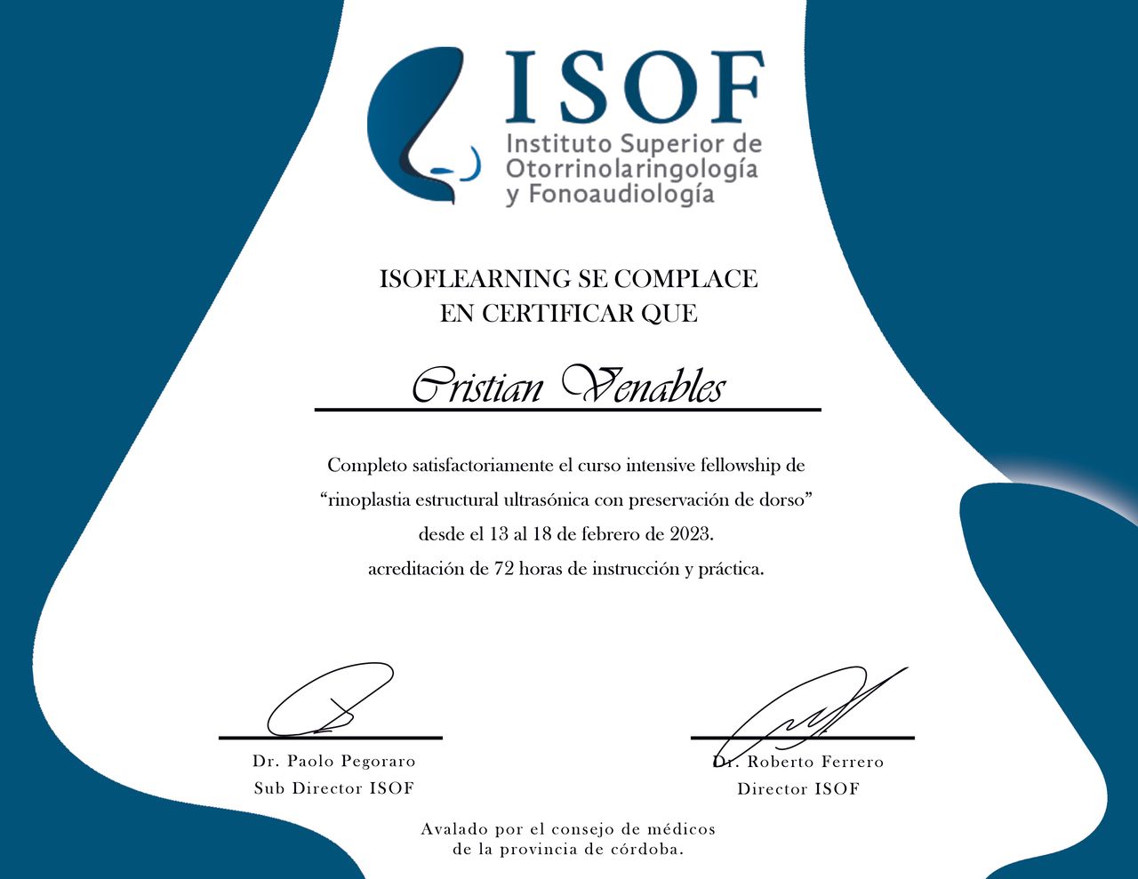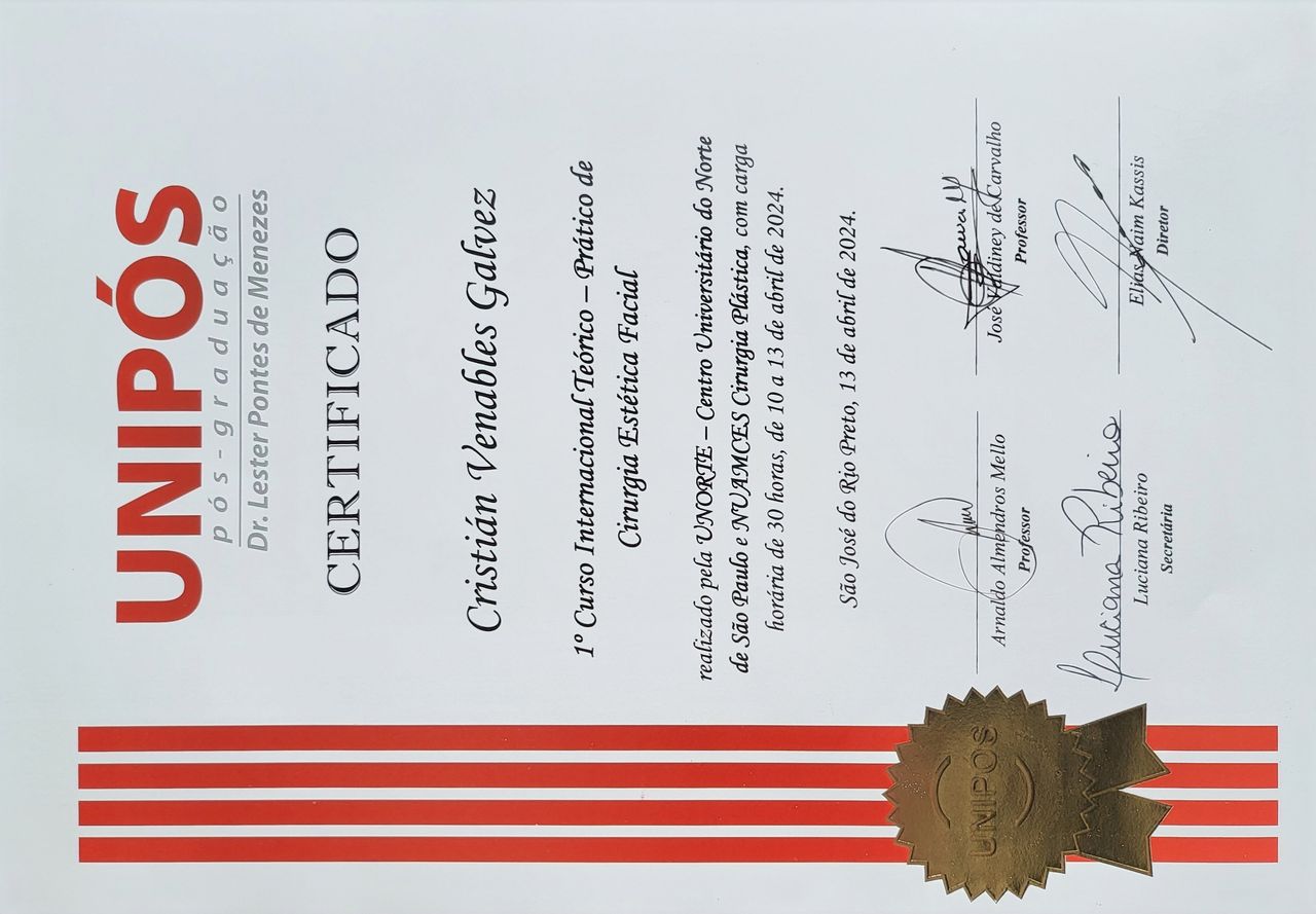 Además cuenta con numerosos cursos de especialización en Cirugía Estética del Rostro, dentro de las que destacan Lifting de Cara y Cuello, y el Fellow completo de Cirugía Estética de Rostro.