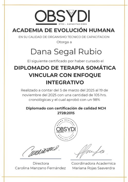 ¡Hola! Bienvenido/a a mi perfil. Soy Dana Segal, psicóloga titulada de la Universidad de La Frontera, con más de 1500 horas de experiencia clínica acompañando a personas adultas (mayores de 18 años) en modalidad presencial y online.