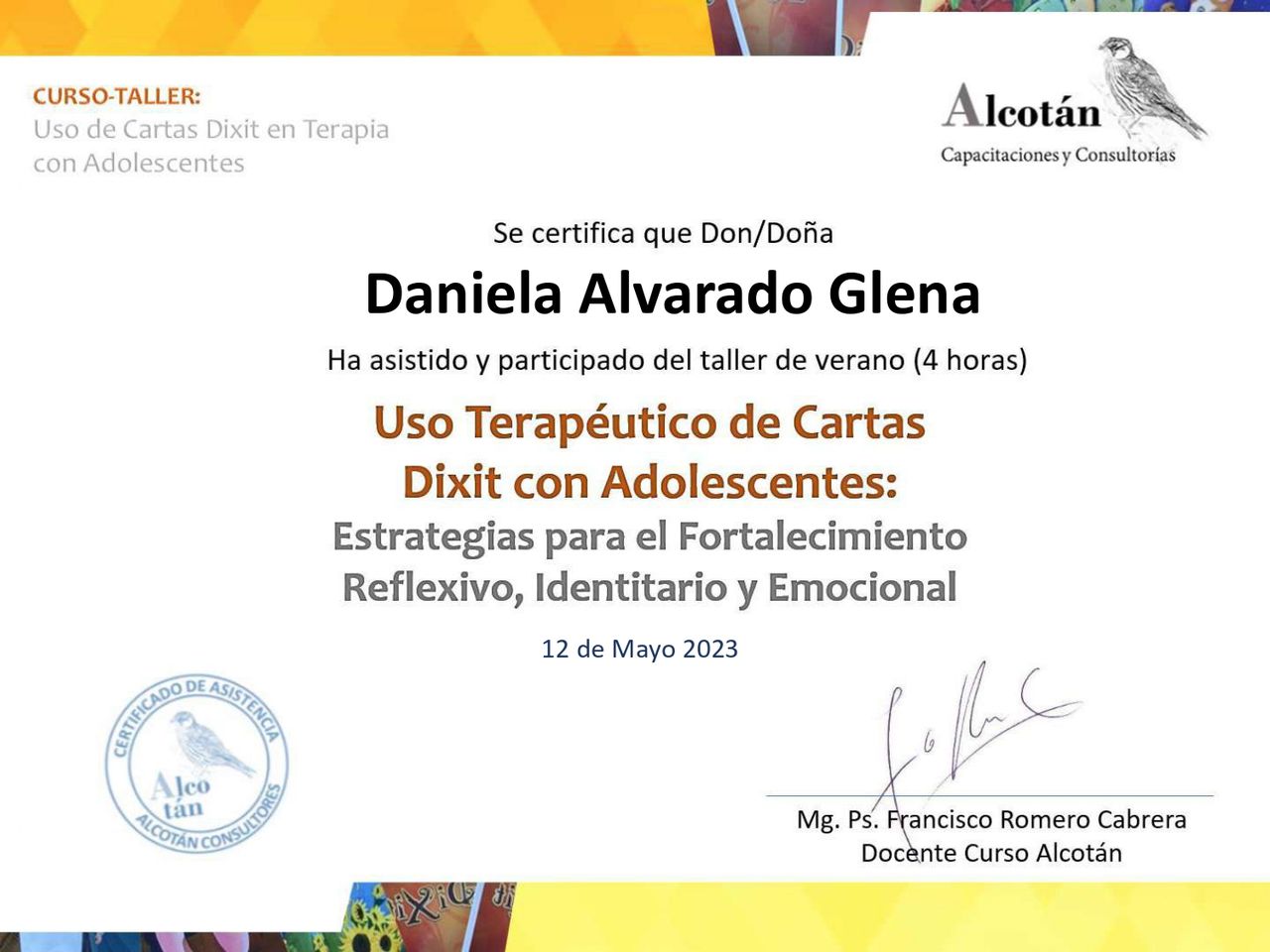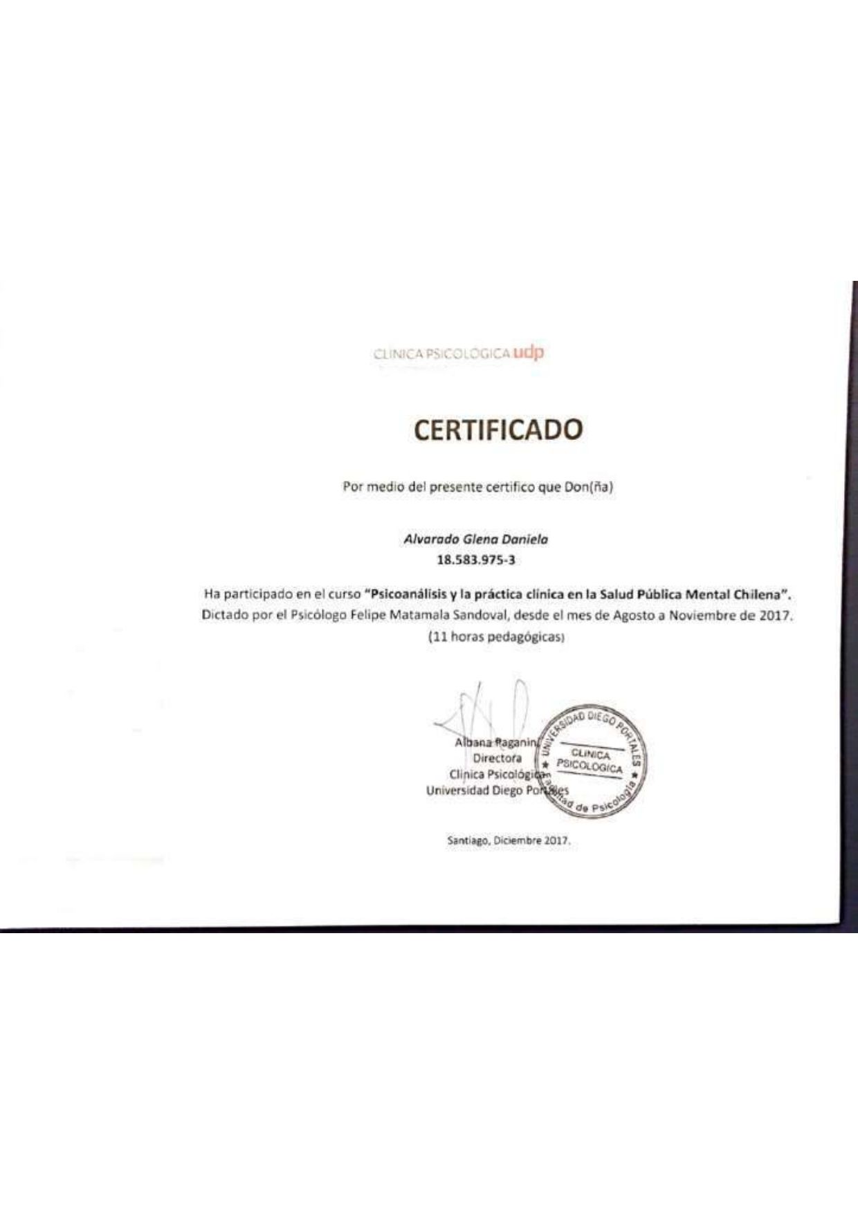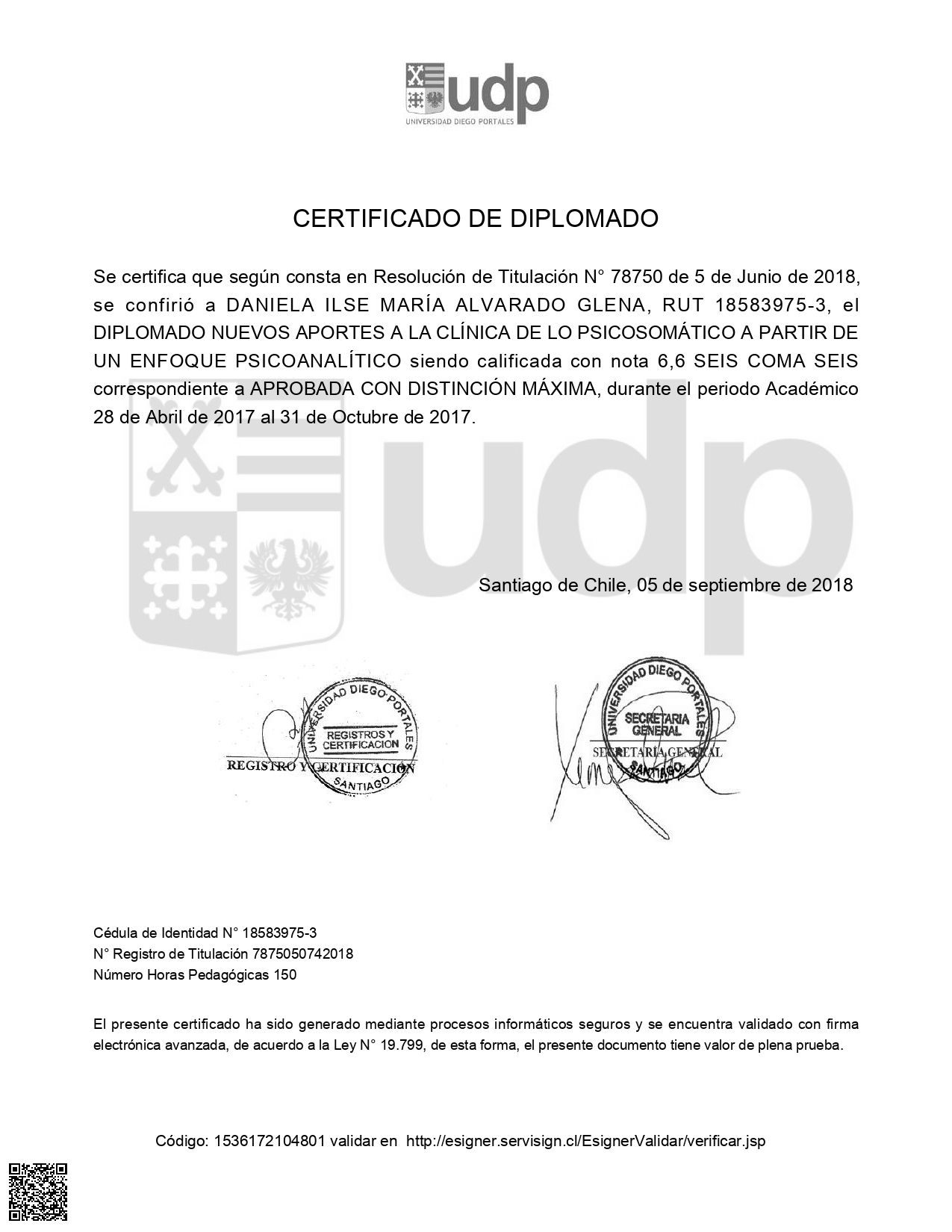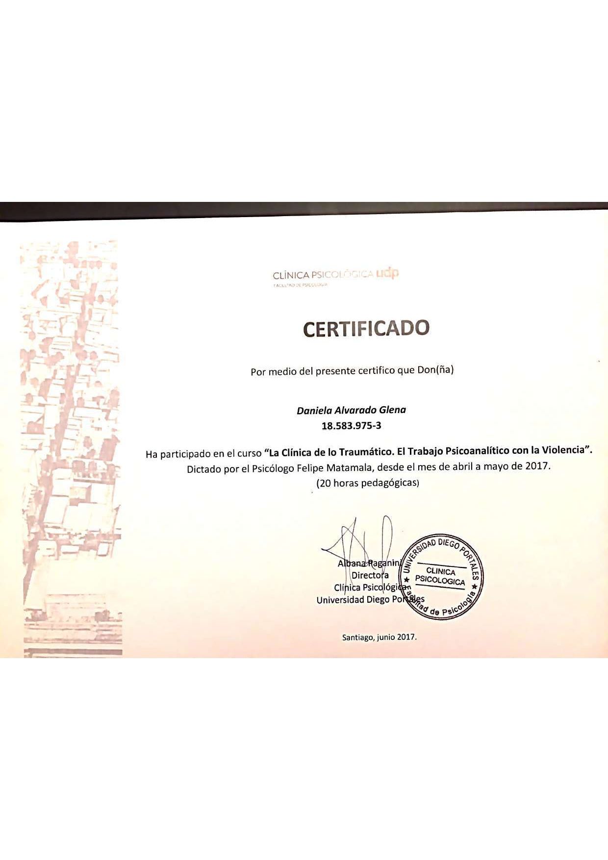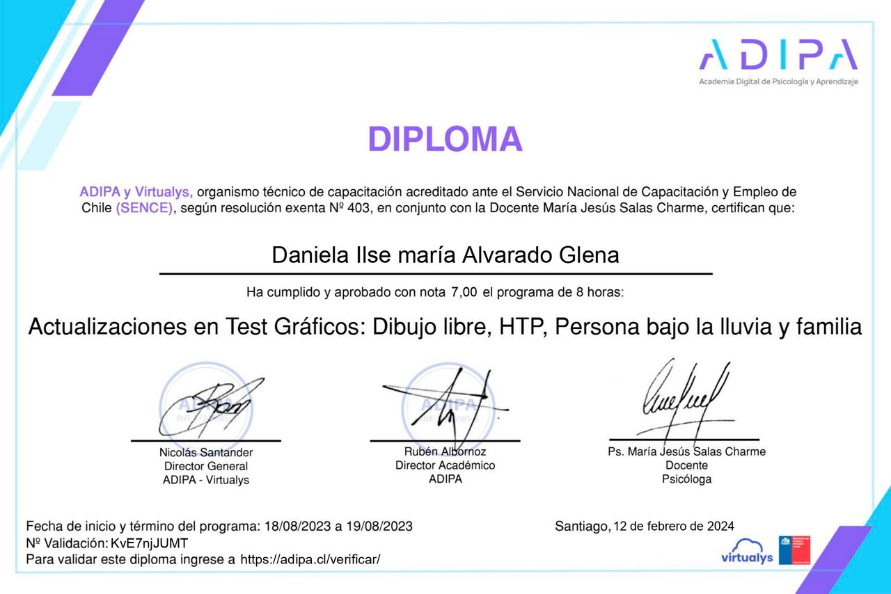 Soy la Psicóloga Daniela Alvarado, egresada de la Universidad Diego Portales (Chile), con postítulo en Complejidad en Trauma Complejo, Diplomado en Terapia Infanto-Juvenil, Diplomado en Clínica Psicosomática (enfoque psicoanalítico) y Magíster en Inteligencia Emocional e Intervenciones en Salud por la Universidad Complutense de Madrid.