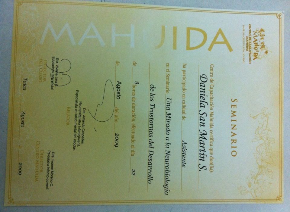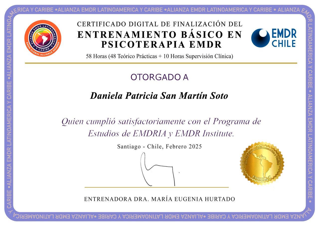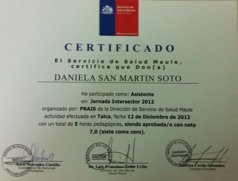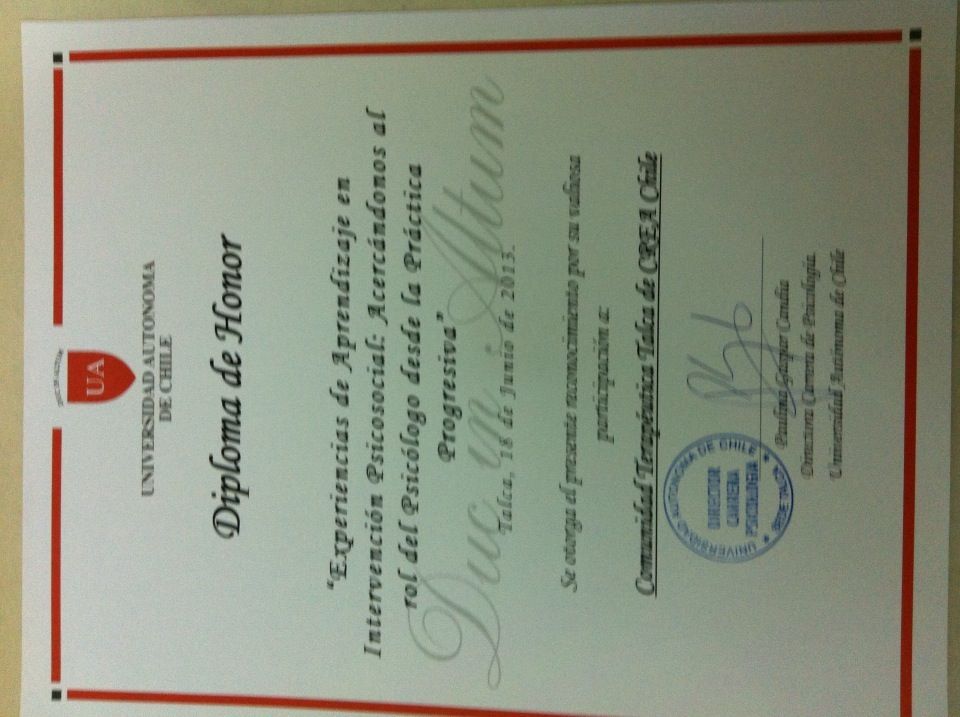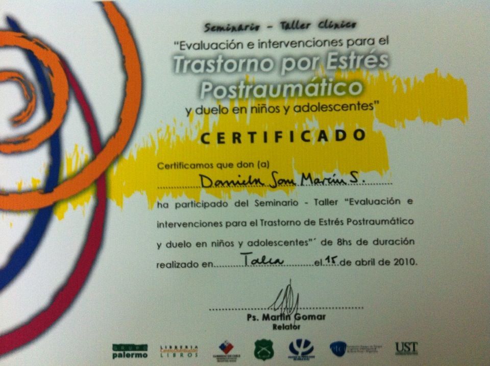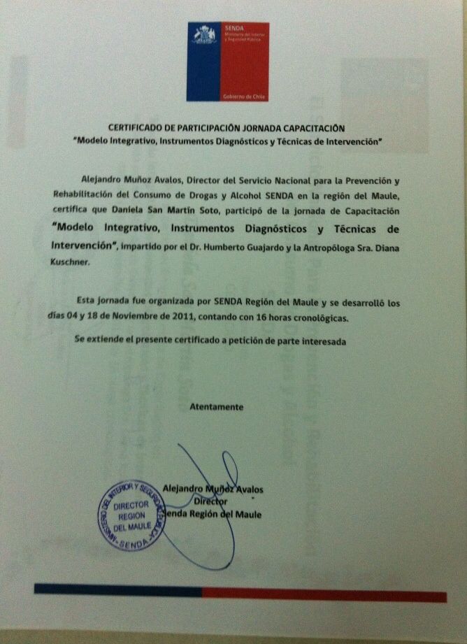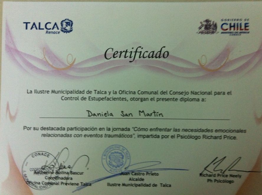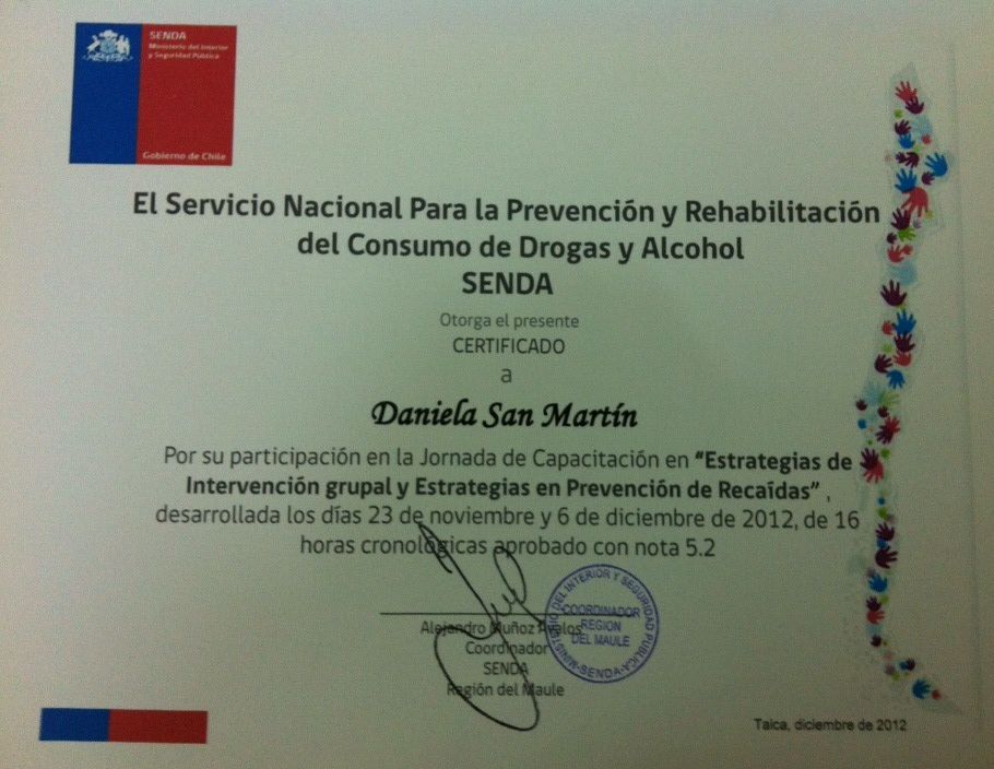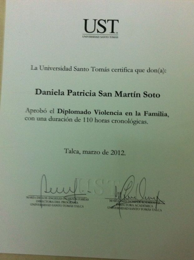Tambiên cuento con un diplomado de VIF y abuso sexual, teniendo herramientas para ayudar a familias que están atravesando por momentos difíciles ante una develación de abuso de un hijo u otro integrante de la familia, o crisis de relaciôn y/o convivencia dentro de una relación de pareja, que se manifiesta con constante y reiterados episodios de maltrato y violencia, siendo un agente de apoyo y de contención ante la situación, además de entregar orientaciones judiciales para proceder en el marco legal ante los hechos.