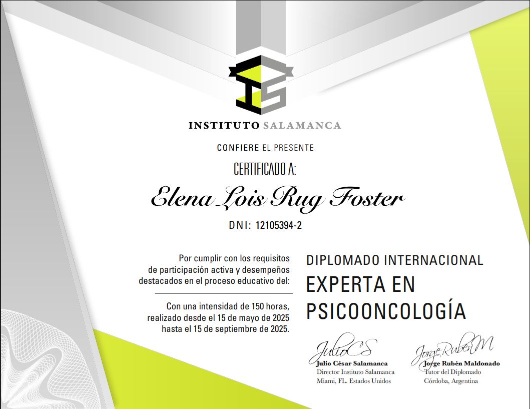 Hola, soy Elena, psicóloga clínica de adultos, familias y parejas con formación sistémico familiar. Completé un magister de esta temática en la Universidad de Chile, y un Diplomado de terapia de pareja en la Universidad Católica. Principalmente me he dedicado a la clínica con temáticas de duelo, pérdidas, trastornos adaptativos, trauma, shock cultural, depresión, ansiedad, temáticas de pareja (infidelidad, trastornos sexuales, violencia, divorcios colaborativos, problemas de comunicación, etc), conflictos familiares, crianza y psico-oncología (diplomado Instituto de Salamanca). Hi, my name is Elena and I am a clinical psychologist for adults, families, and couples from a systems therapy perspective. I completed my masters in this area at the Universidad de Chile and a certificate in couples therapy at the Universidad Católica. I have worked with grief, loss, adaptive disorders, trauma, culture shock, depression, anxiety, couples (infidelity, sexual disorders, violence, collaborative divorce, communication skills, etc), family conflicts, parenting, and psico-oncology.