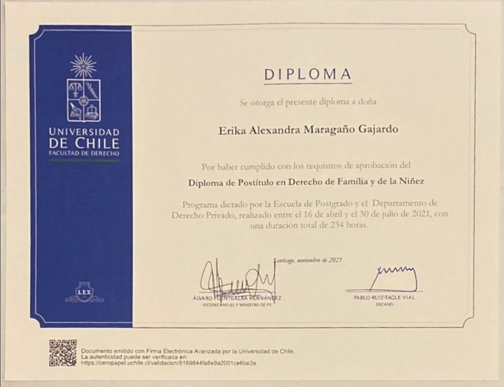 Psicóloga Perito de la Corte de Apelaciones de Santiago - Tribunal de Familia Bienio 2026-2027. Adscrita al Registro Nacional de Mediadores en 1º, 2º, 3º y 4º Juzgado de Familia de Santiago.
