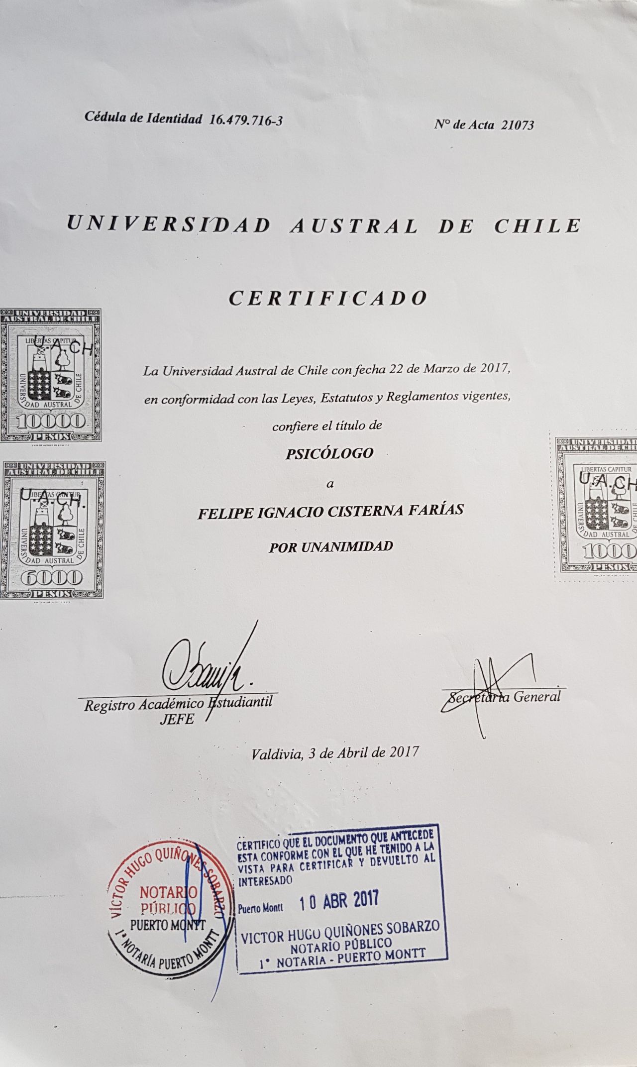 Agradezco al profesional psicólogo Felipe Cisterna Farias, su amable atención, honestidad, empatía, sus recomendaciones y claridad al momento de la consulta.