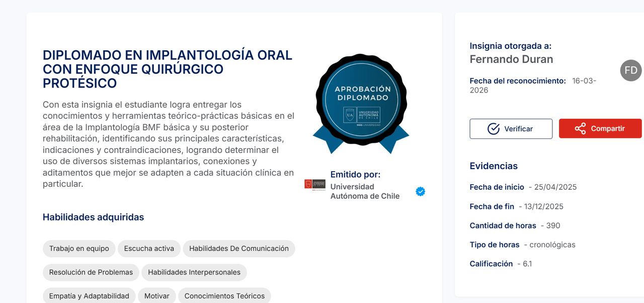 Hola a todos mis queridos pacientes hoy tengo el orgullo de informar que he terminado mi diplomado en implantología, cursado en la universidad autónoma sede Santiago, esto me permite abrir mi campo clínico y ofrecerles a ustedes soluciones frente a la perdida irremediable de un diente y su posterior rehabilitación implanto asistida, no duden en consultar. Un abrazo fraterno a todos.