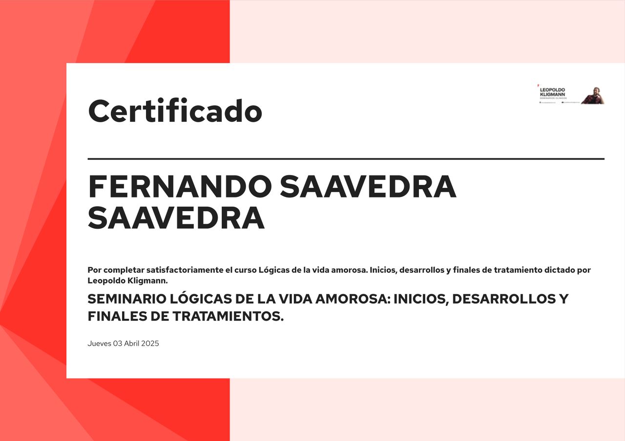 Conocer a Fernando me ha ayudado mucho en la vida, logre comprender muchas partes de mi vida que eran difíciles de descifrar, mejore mi relación con mis cercanos y mi estabilidad en el trabajo y estudios, he podido reconectar con mi niño interior sin temor a recordar mi niñez y adolescencia, muchas gracias Fernando por siempre dar de tu buena disposición para poder hacer de cada sesión un pequeño avance en mi vida y mi proceso, gracias por tu empatía y conexión conmigo, ha sido de mucha ayuda, ademas de las risas y los buenos momentos en las sesión. Seguiremos en el proceso, un paso a la ves. Por siempre agradecido.