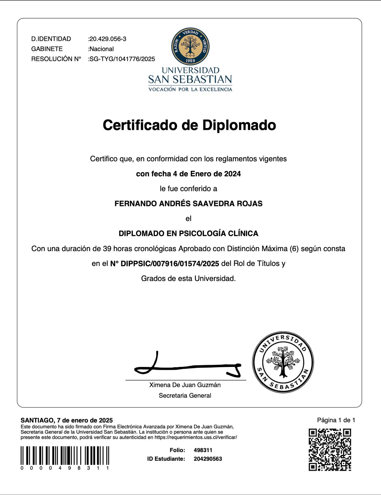 Sobre mí Soy psicólogo clínico titulado por la Universidad San Sebastián, con un diplomado en Psicología Clínica por la misma casa de estudios. Además, cursé el diplomado “Salud Mental: Ejercicio Psicoanalítico” en el Instituto ADIPA. He profundizado mi formación en seminarios clínicos y grupos de estudio dedicados a la teoría psicoanalítica y al análisis de casos complejos. Actualmente, realizo atención en modalidad presencial y/o online, buscando mantener un encuadre flexible y ético que se adapte a las necesidades de cada consultante. Cada quien merece un espacio donde su palabra tenga lugar.