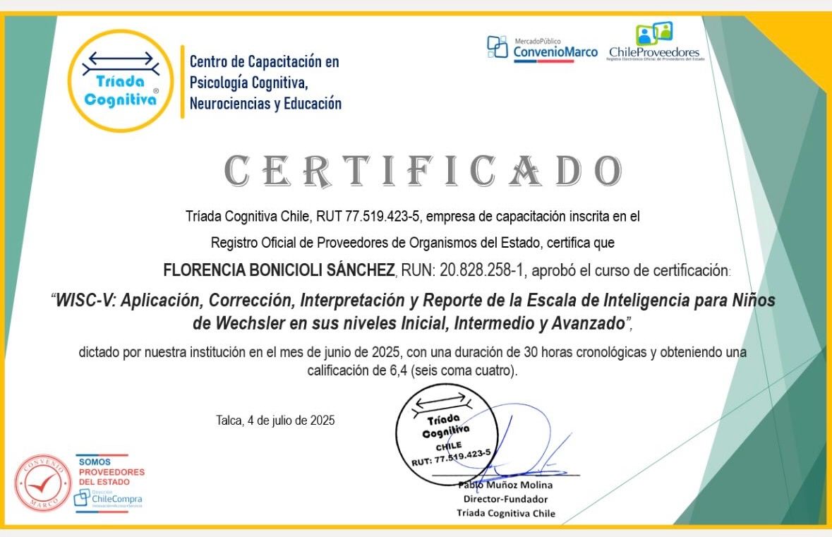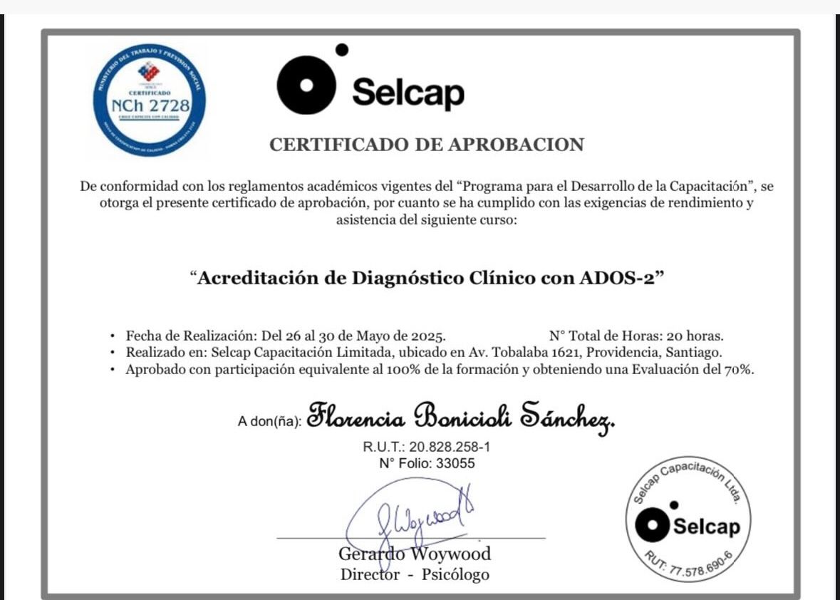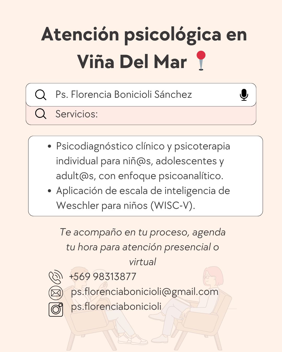 Soy Florencia Bonicioli, psicóloga recién titulada de la Universidad Andrés Bello. Iniciar un proceso terapéutico es un acto valiente, y mi compromiso es acompañarte en este camino con una escucha atenta y una comprensión profunda de lo que te sucede. Trabajo desde un enfoque psicoanalítico, lo que significa que no solo abordamos los síntomas, sino que exploramos juntos las raíces de tu malestar, permitiéndote entenderte mejor y encontrar nuevas formas de afrontar lo que hoy te inquieta. Más que ofrecer respuestas inmediatas, mi propósito es brindarte un espacio donde puedas hablar libremente, sin juicios ni presiones, y en el que construyamos juntos un proceso a tu medida. Mi formación y sensibilidad hacia las experiencias únicas de cada persona me llevan a trabajar con cercanía, respeto y un profundo interés por aquello que te mueve. Si sientes que algo en tu vida necesita ser escuchado, si hay preguntas que vuelven o emociones que no logras comprender del todo, estoy aquí para acompañarte en esa búsqueda. Te invito a darte el espacio y el tiempo para explorar lo que te sucede. ATENCIÓN PRESENCIAL Y VIRTUAL.