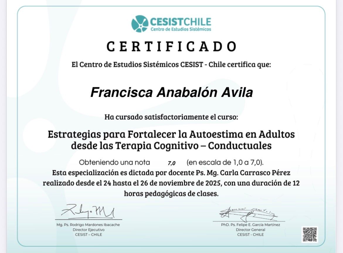 Francisca me ha brindado herramientas muy útiles frente a las situaciones que surgen, tiene un espacio en el cual una se siente segura de hablar, genera un lugar y ambiente seguro.