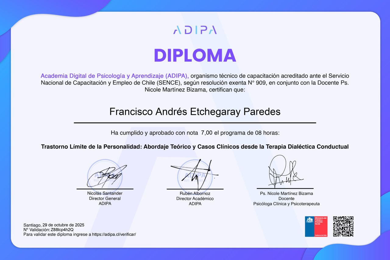 En la Primera Sesión te entrego de inmediato una explicación certera, ahorrándote años de terapia, de cómo las frustraciones en la relación con tus padres y en tu infancia influyeron en la problemática actual por la cuál consultas y cómo terminaste tú mismo/a creándola. Esto lo hago identificando rápidamente qué episodios específicos de tu infancia impactaron en tu sistema nervioso al punto en que afectaron la manera en la que te percibes a ti mismo y al mundo, y explicándote cómo las emociones que quedaron estancadas en tu sistema nervioso te llevan a recrear las mismas situaciones por años o décadas, en un intento inconsciente por sanar aquellas heridas que creíste "superadas" (Ejemplo: Elegir una y otra vez el mismo tipo de pareja; saltar de una adicción a otra; reciclar creencias catastróficas que te impiden avanzar por miedo; estresarte con distintas situaciones que activan tus mismas reacciones; etc.). Mi enfoque está orientado a romper definitivamente los patrones antiguos y automáticos que te dominan inconscientemente, creando nuevas disciplinas para dirigir tu mente y regular tus emociones, a través de sistemas estructurados que llamaremos Mentalidades y que con el tiempo podrás utilizarlos de manera independiente fuera de la terapia. El beneficio es que estas disciplinas no sólo te servirán para resolver el problema por el cual consultas, sino para aplicarlas en cualquier área de tu vida que desees.