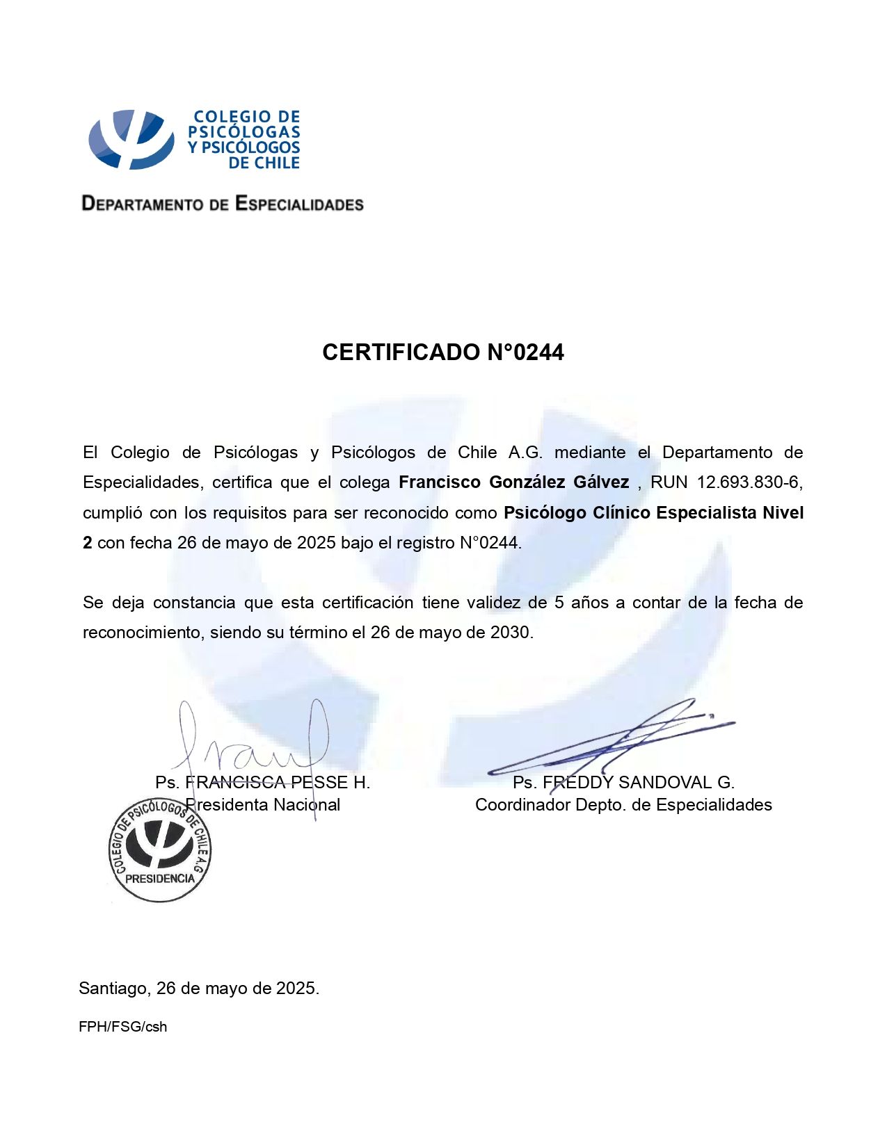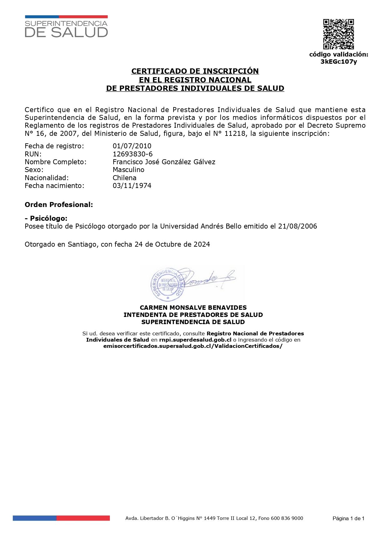 Soy Psicólogo, poseo formación en psicoterapia, neuropsicología y salud familiar, 20 años de experiencia, me encuentro certificado por el colegio de psicólogos de Chile. He trabajado en centros de salud tanto públicos y privados, atendiendo población juvenil y adulta, formando parte de equipos multidisciplinarios de salud Familiar y mental. Además poseo experiencia en evaluaciones de salud ocupacional.