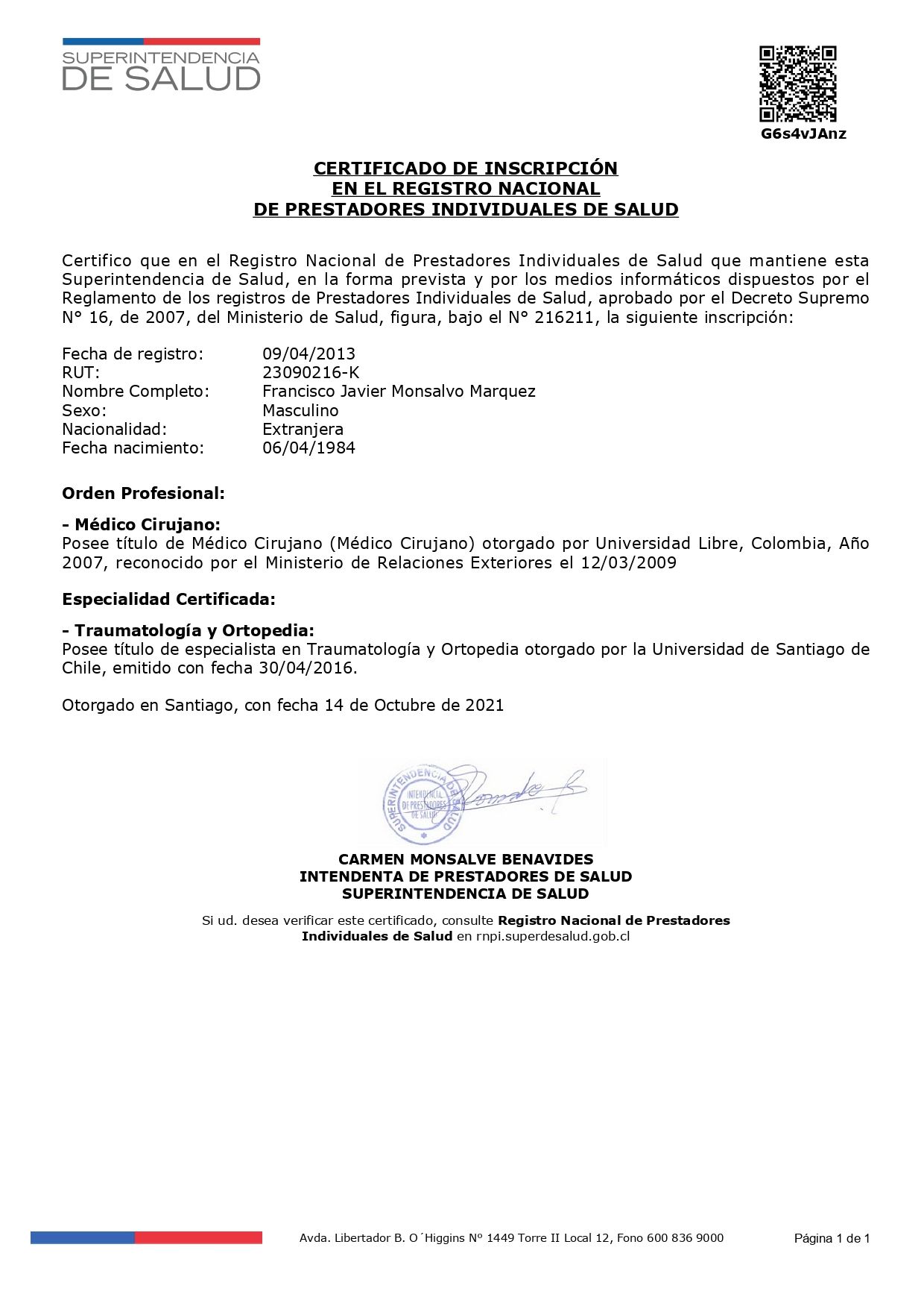 Estoy conforme con la operación de protesis de cadera, realizando por el Dr Francisco Monsalvo, excelente profesional.