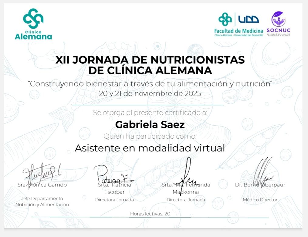 Consulta Presencial Concepción Centro, Región del Bio Bio - Ongolmo 361: Martes PM, Miércoles, Sábados (Centro Médico DC) - Ongolmo 174, tercer piso: Lunes y Viernes. (Centro Médico Pediátrico) - Cardenio Avello 36: Jueves AM-PM (Clínica del Sur, Achs Salud) Nutricionista egresada de la Universidad de Concepción. *Diplomado en Nutrición Pediátrica y del Adolescente, Pontificia Universidad Católica de Chile, año 2022 *Diplomado en Nutrición Deportiva, Universidad San Sebastián, año 2019 *Diplomado en Endocrinología y Diabetes en edad pediátrica 2024-2025, Sociedad Chilena de Pediatría. (116 hrs académicas) *Certificación Internacional en Nutrición Oncológica (2022-2023) 101 hrs académicas *Certificación Internacional en Cirugías de la Obesidad con enfoque en C. Bariátrica (2023) 86 hrs académicas *Certificación Internacional en Nutrición Deportiva y Fitness (2023-2024) 143 hrs académicas *Participación en VI Congreso de Cirugía Bariátrica y Metabólica (2023) 27 hrs académicas *Participación en VII Congreso de Cirugía Bariátrica y Metabólica (2024) 27 hrs académicas *Participación en VII Congreso Nacional de Oncología Médica (2024) 30 hrs académicas *Participación en el 63 Congreso Chileno de Pediatría (2024) 48 hrs académicas. Amplia experiencia en atención, consulta nutricionales y trabajo con pacientes