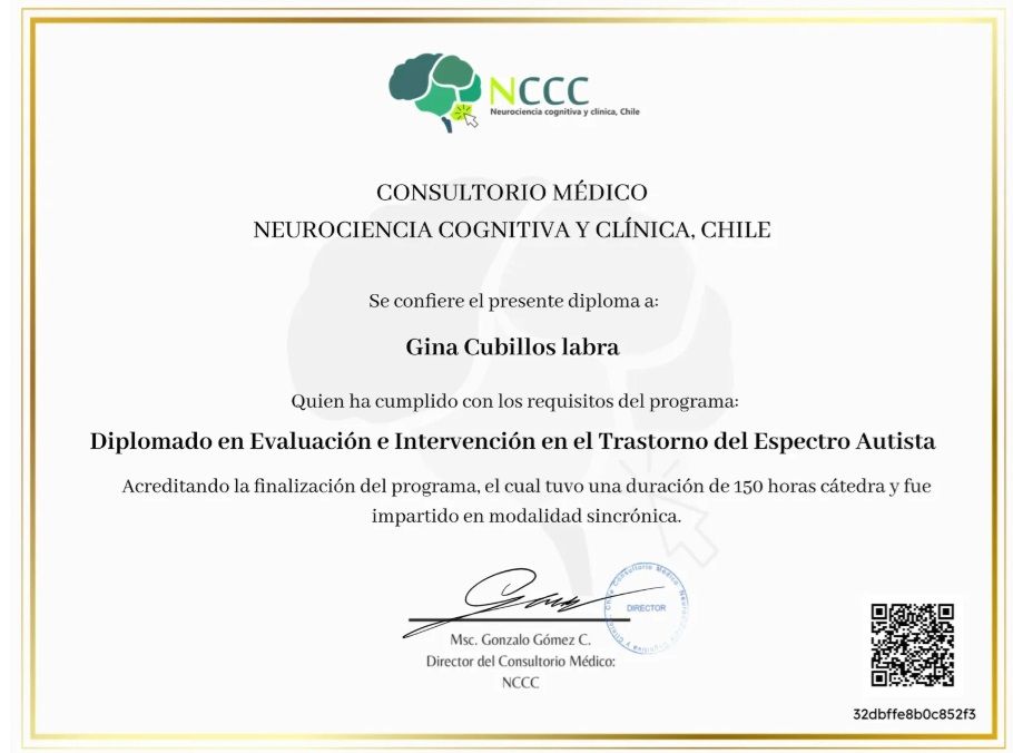 Mi nombre es Gina Cubillos, psicóloga online, y ofrezco mis servicios principalmente en horario de tarde-noche para brindar mayor accesibilidad a mis pacientes. Me especializo en Psicoterapia breve con adolescentes y adultos, abordando diversas temáticas como: Apoyo a personas con Trastorno del Espectro Autista (TEA) y discapacidad. Abuso sexual. Violencia intrafamiliar. Ansiedad. Depresión. Consumo problemático de drogas y alcohol. Adicionalmente, realizo evaluaciones psicométricas (CI) a domicilio.