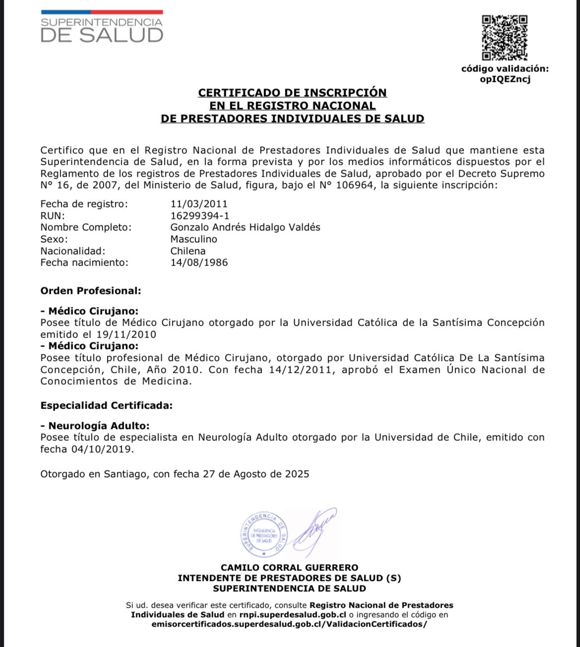 Neurólogo de adultos de la Universidad de ChileEgresado de Medicina cum laudeTrato amable, interés genuino, profesionalismo.