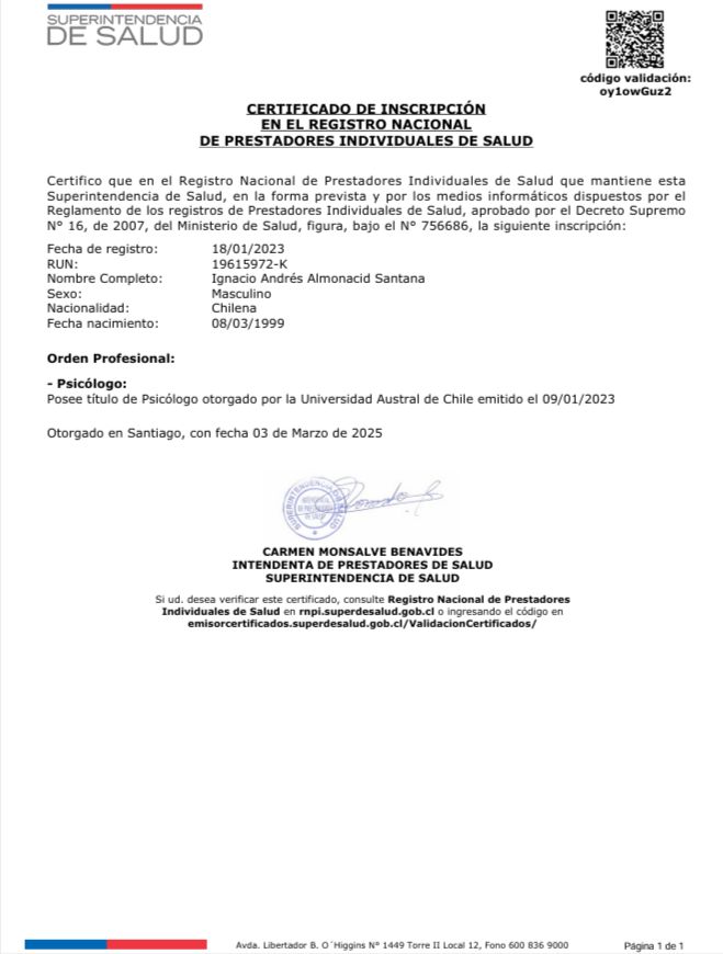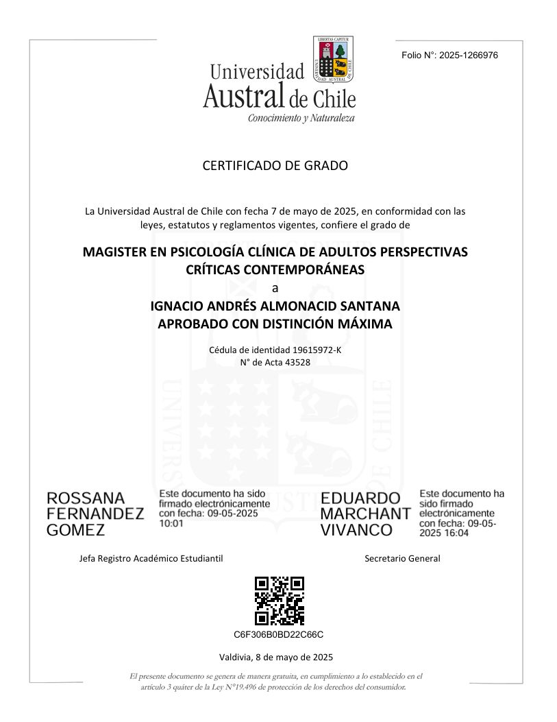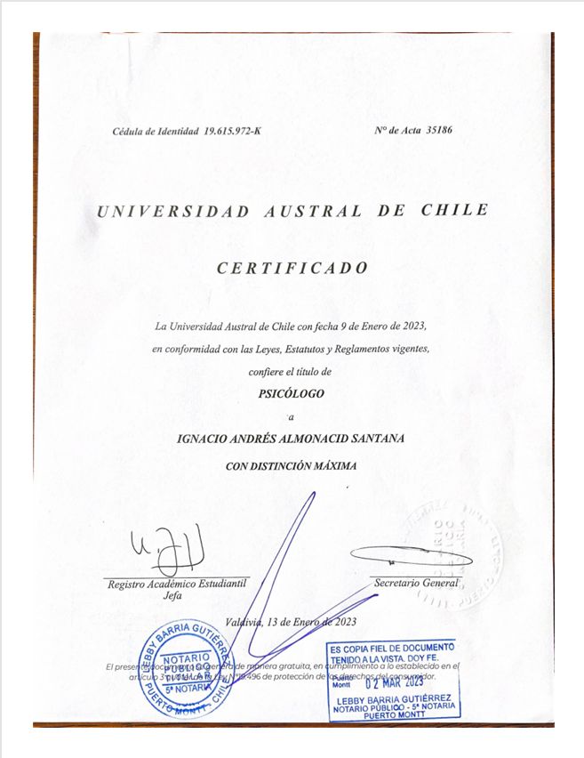 Soy psicólogo con más de tres años de experiencia en atención clínica. Cuento con el grado de Magíster en Psicología Clínica de Adultos, otorgado con distinción máxima por la Universidad Austral de Chile, formación en la que he desarrollado un enfoque contemporáneo, crítico y reflexivo.