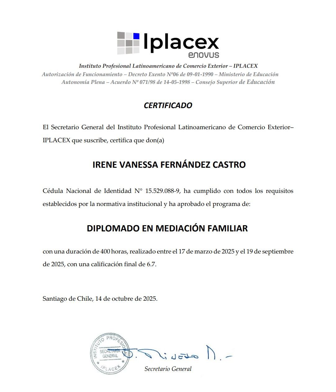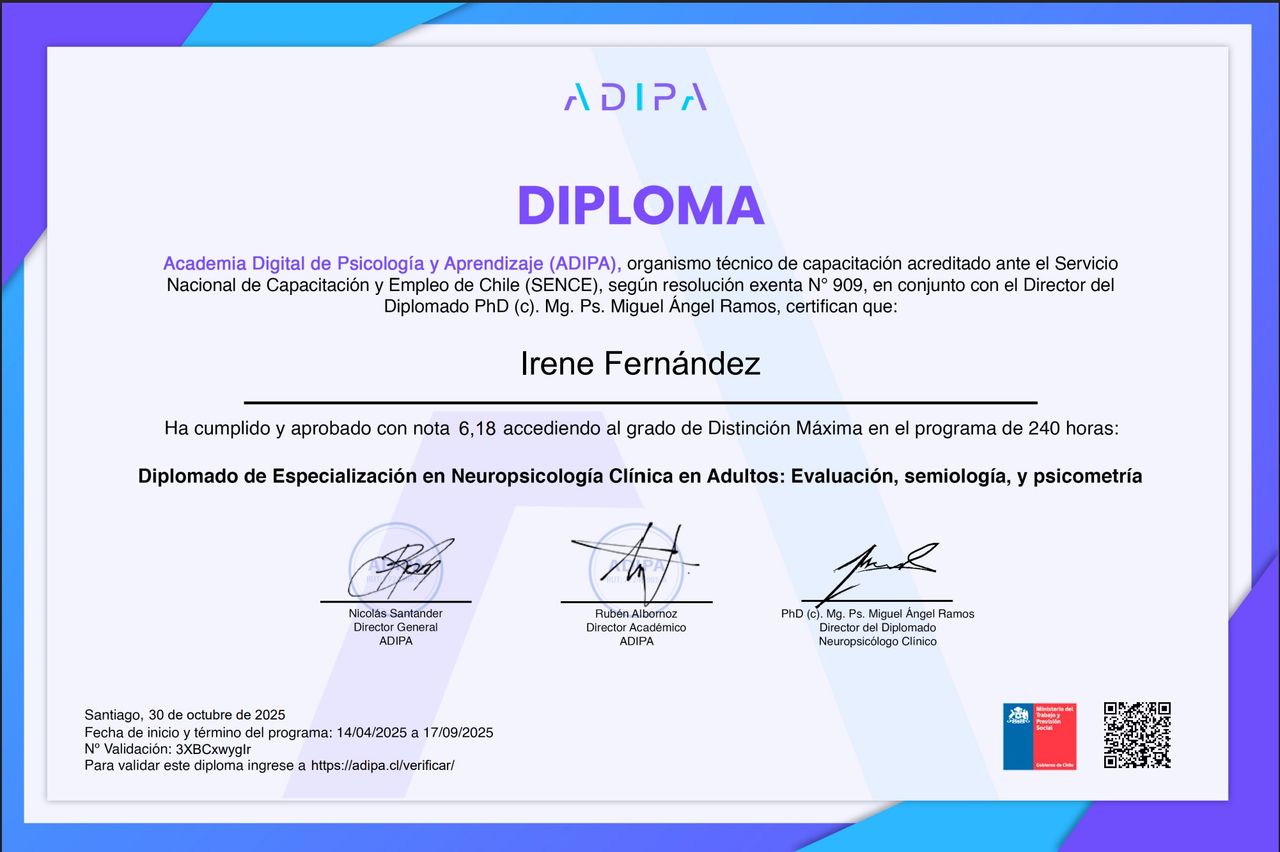 Soy Psicóloga titulada de la Universidad Andrés Bello y Trabajadora Social de la Universidad Católica de la Santísima Concepción, con más de 15 años de experiencia en el sector público de salud. Cuento con formación especializada en Neuropsicología Clínica en Adultos (Diplomado 2025) y Mediación Familiar (Diplomado 2025), además de formación en Gestión en Salud Pública.