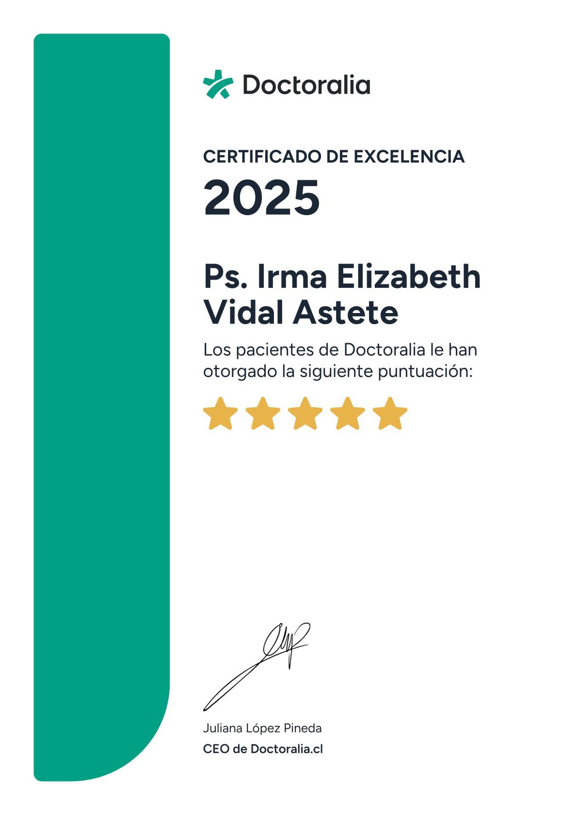 ¡Hola! ¿Cómo estás?, desde mi experiencia te puedo comentar que tengo: Diplomado en psicoterapia infantil Diplomado en psicoterapia adolescente Diplomado en psicoterapia adulto Diplomado en diagnóstico e intervención en autoestima De la universidad salí con distinción máxima, esto gracias a mi esfuerzo y compromiso con la profesión,. Por otro lado, estoy Certificada en terapia cognitivo conductual (TCC), para trabajar el trastorno depresivo mayor en adolescentes. Certificada en evaluación de la impulsividad adulto, para informes judiciales o similares. Certifica en Trastorno límite de la personalidad (TLP). Tengo experiencia con niños, adolescentes y adultos, trastornos del estado de animo, trastorno adaptativo, evaluación en trastorno por déficit de atención e hiperactividad (TDAH), trastorno de ansiedad generalizada, crisis de pánico, trastorno de ansiedad social (fobia social), trastorno depresivo mayor, problemas de autoestima, dificultades de apego, primeros auxilios psicológicos, duelos, técnicas de relajación para momentos de mucho estrés, entre otros. Asimismo, aplico test vocacional para adolescentes y trabajo en la orientación hacia lo que desean para su futuro. Como psicóloga clínica, aplico instrumentos psicométricos validados, los que ayudan a clarificar más aun dicho diagnóstico. Por último entrego certificado o informe psicológico si así se requiere. Si deseas trabajar conmigo, te puedo brindar la mayor seguridad en nuestras sesiones, en un ambiente de resguardo, donde la confidencialidad y el respeto estará presente en cada sesión.