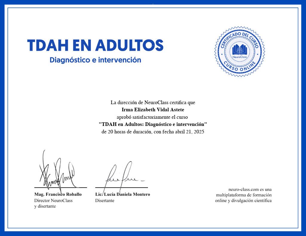 De la universidad salí con distinción máxima, esto gracias a mi esfuerzo y compromiso con la profesión,. Por otro lado, estoy Certificada en terapia cognitivo conductual (TCC), para trabajar el trastorno depresivo mayor en adolescentes. Certificada en evaluación de la impulsividad adulto, para informes judiciales o similares.