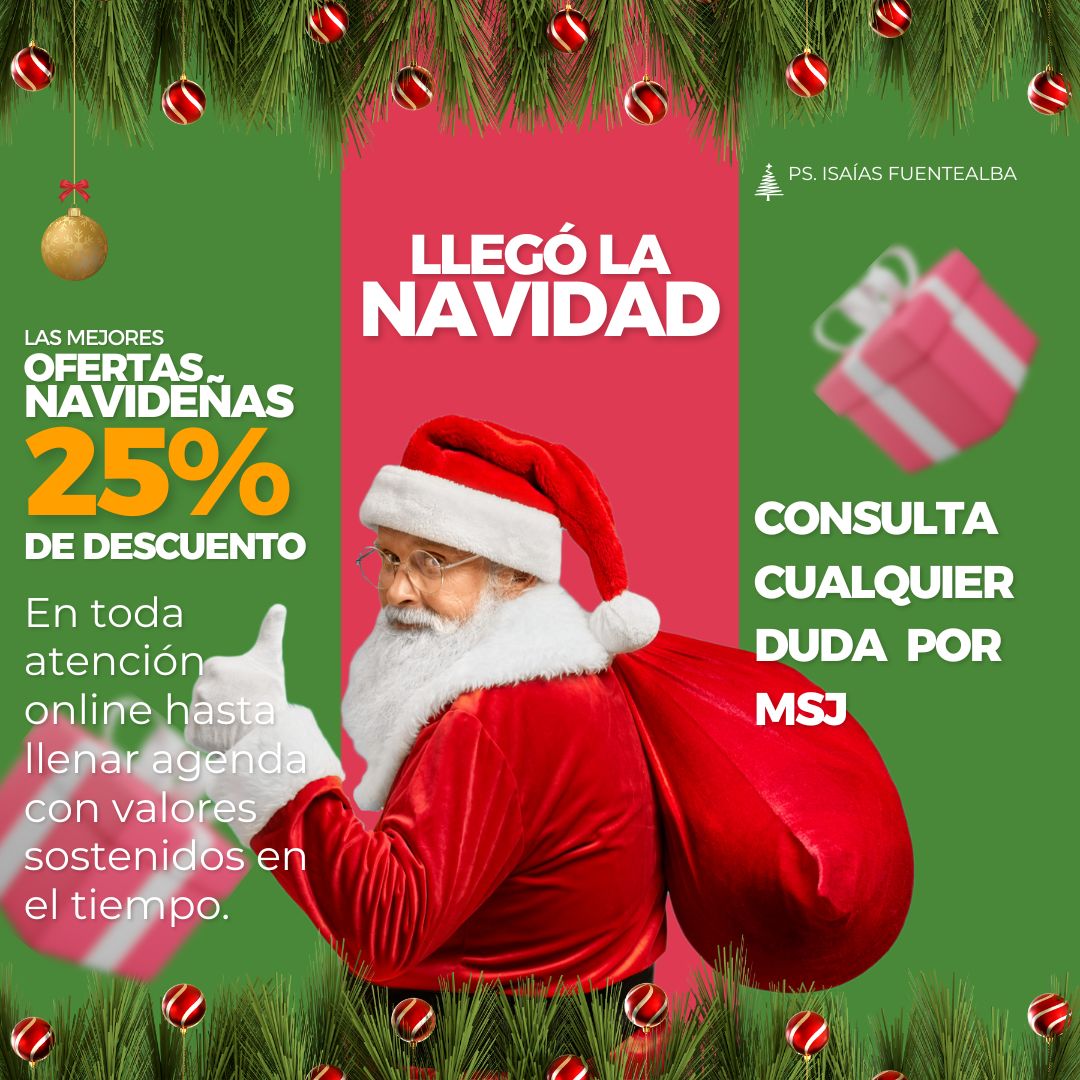¡Feliz navidad, aprovecha los descuentos de atención online, en todas las sesiones de este periodo recibirás un descuento del 20% para pacientes nuevos, también por cada recomendación que hagas podrás optar a un 50% de descuento en una sesión.