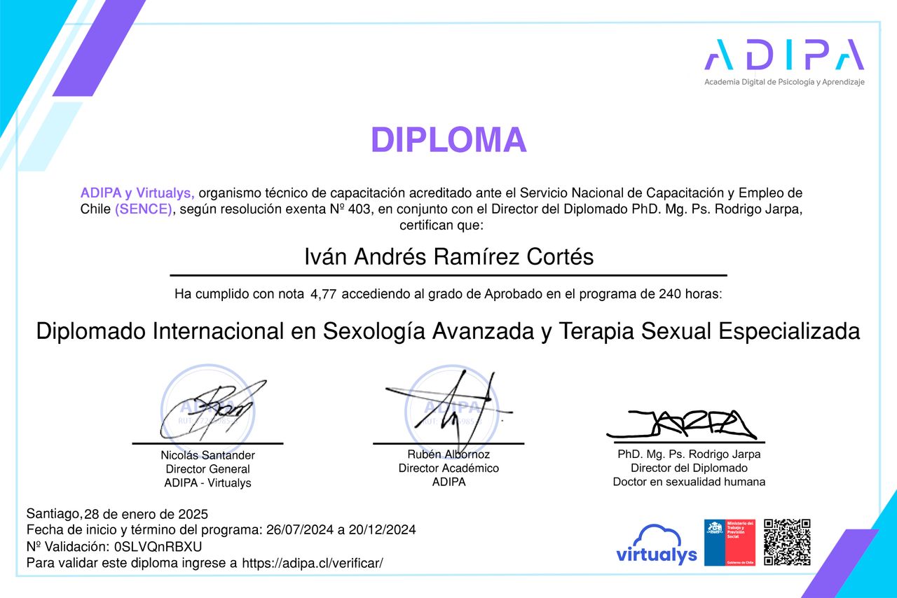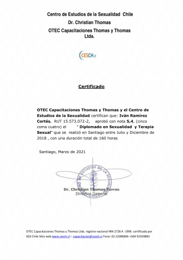 Soy terapeuta especializado en bienestar integral de la sexualidad, con formación en sexología, terapia sexual, sex coaching y terapia tántrica. Soy cofundador del Centro Amor Propio®, institución dedicada al acompañamiento terapéutico y educativo en sexualidad consciente, fundada en Chile en 2016.