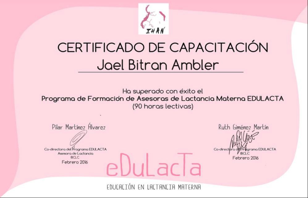 Complementario a mi título profesional, realicé capacitación como Asesora de Lactancia Edulacta, herramientas con las cuales acompaño desde el 2015 a gestantes, puérperas y sus familias en el empoderamiento, información y resolución de problemáticas relacionadas con la lactancia de sus hijos/as, desde una mirada de crianza respetuosa y conexión con el propio cuerpo.