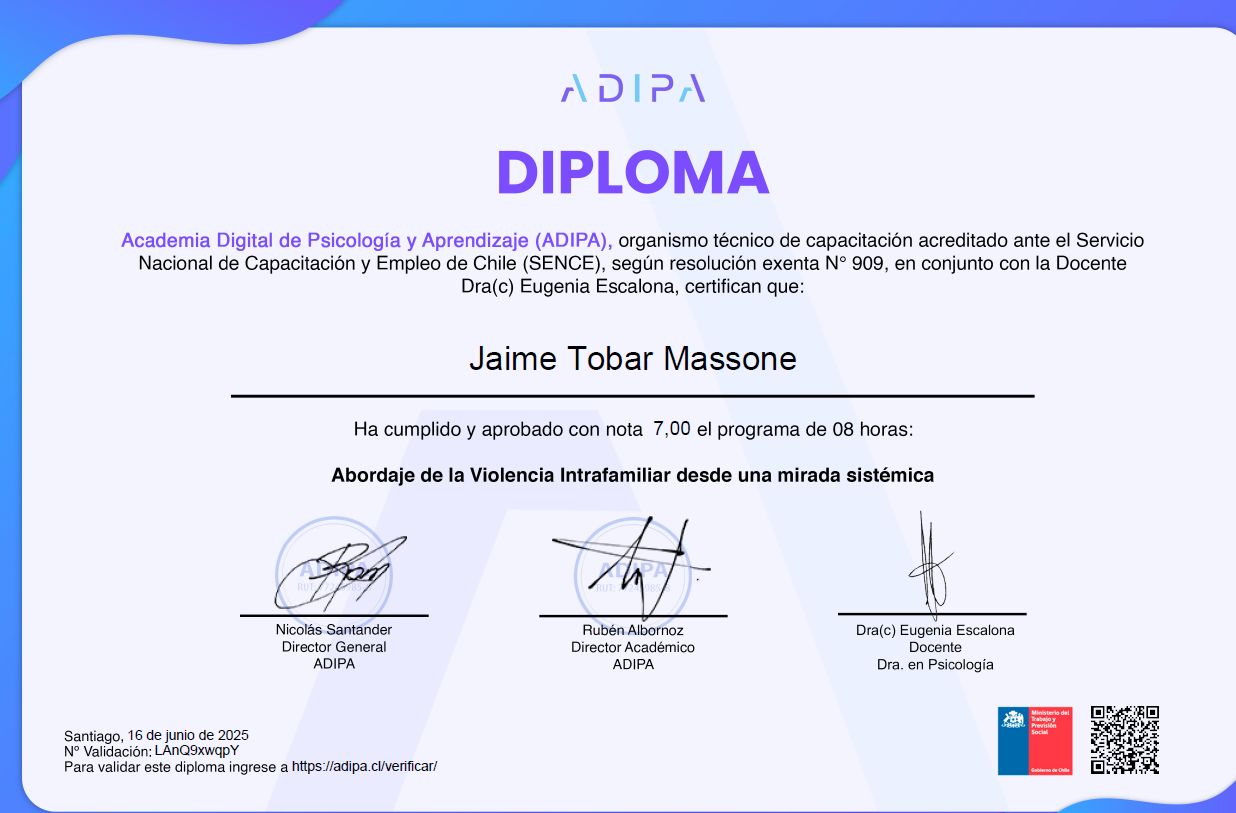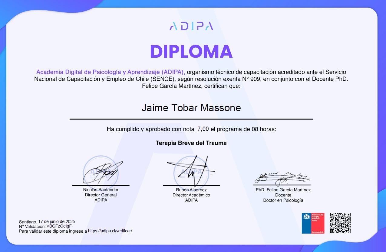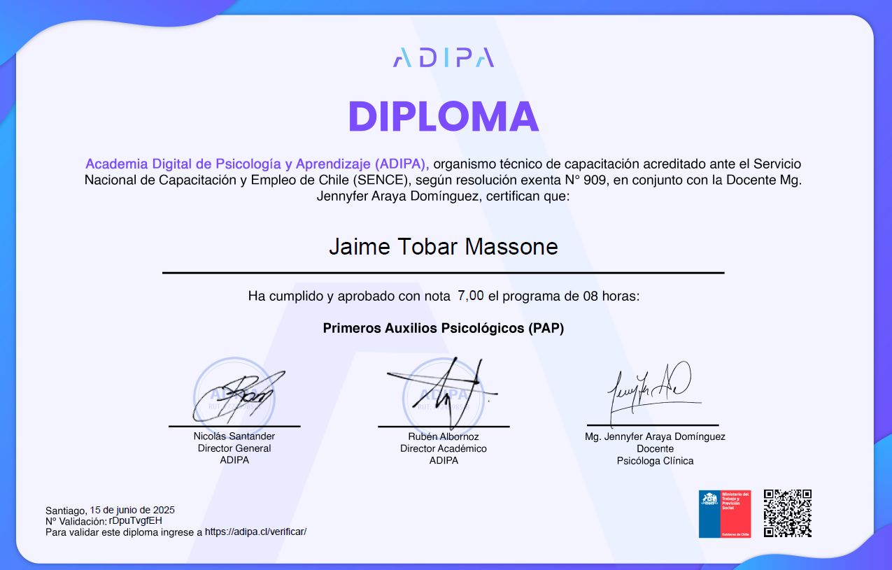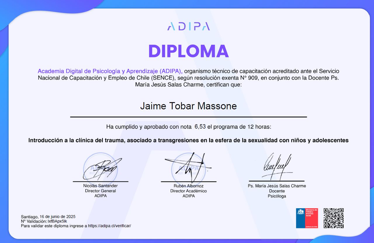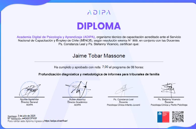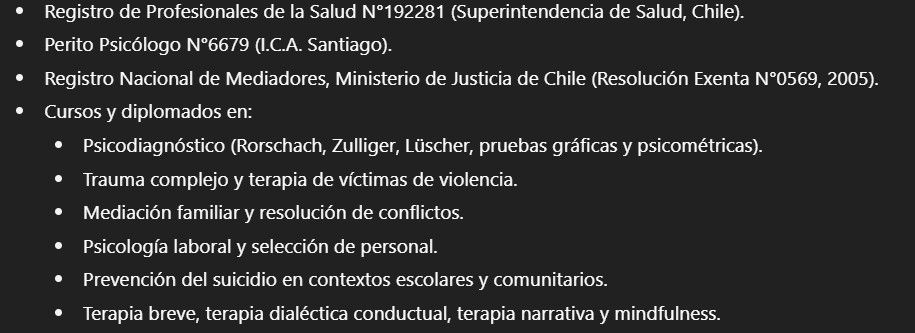 Psicólogo Clínico-Jurídico y Perito Psicólogo, con atención a niños, adolescentes, adultos y familias. Especialista en psicoterapia del trauma complejo, terapia de pareja y familiar, resolución de conflictos y mediación familiar. Cuento con amplia experiencia en evaluaciones periciales, informes psicológicos para tribunales y en la certificación de control de impulsos para guardias de seguridad y personal de alto riesgo. Mi trabajo combina lo clínico y lo jurídico, siempre con un enfoque humano, ético y basado en la evidencia científica. Atiendo en Centro Psicológico Integral (Quellón) y en modalidad online.