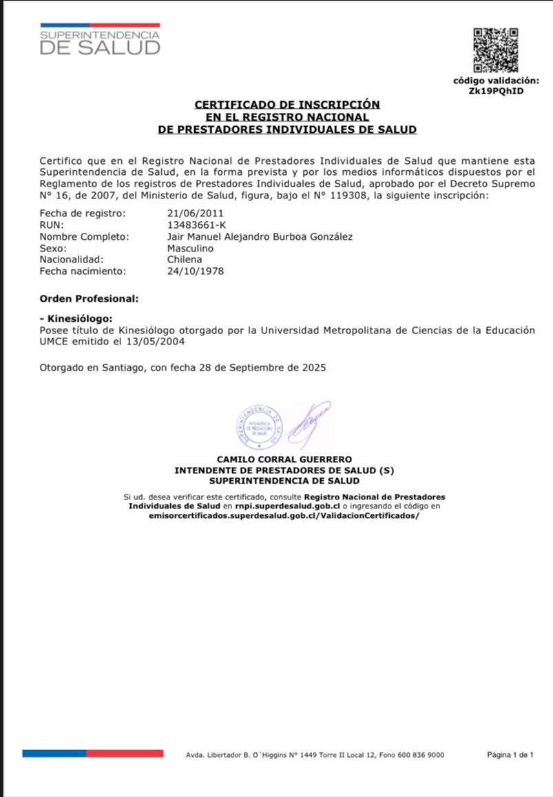 Mi práctica se respalda en la evidencia científica y la docencia: soy profesor universitario y he presidido la Sociedad Científica Chilena de Kinesiología Deportiva (SOKIDE), lo que garantiza que tu tratamiento contará con los estándares más actualizados de la profesión.