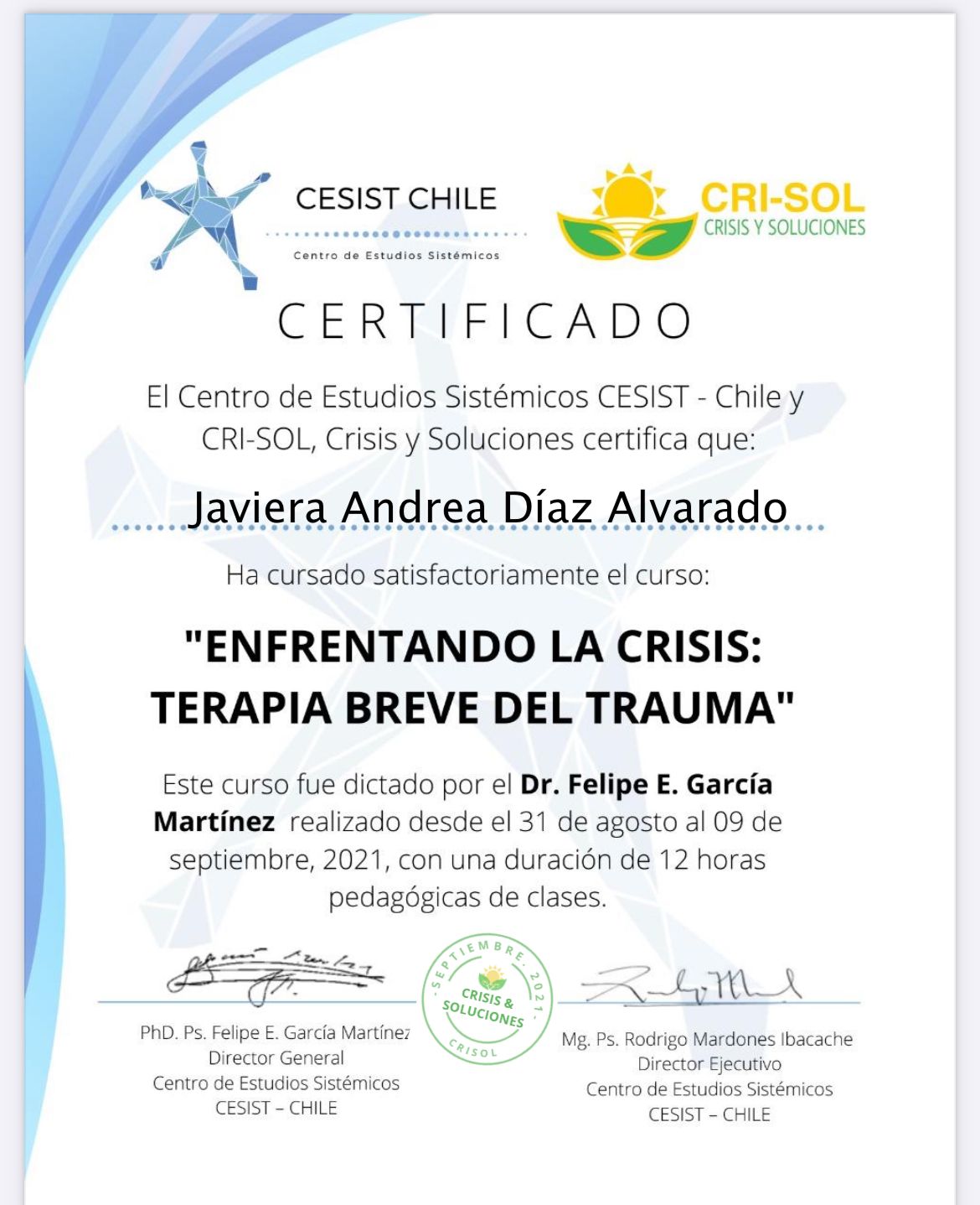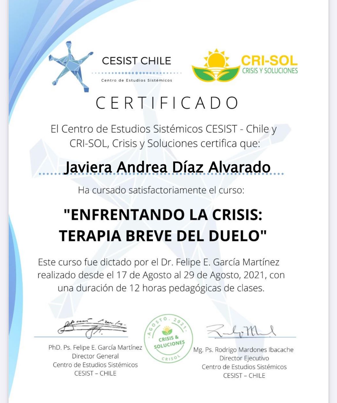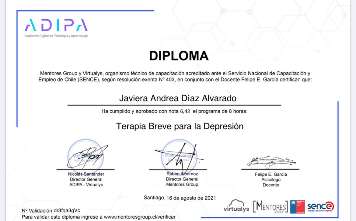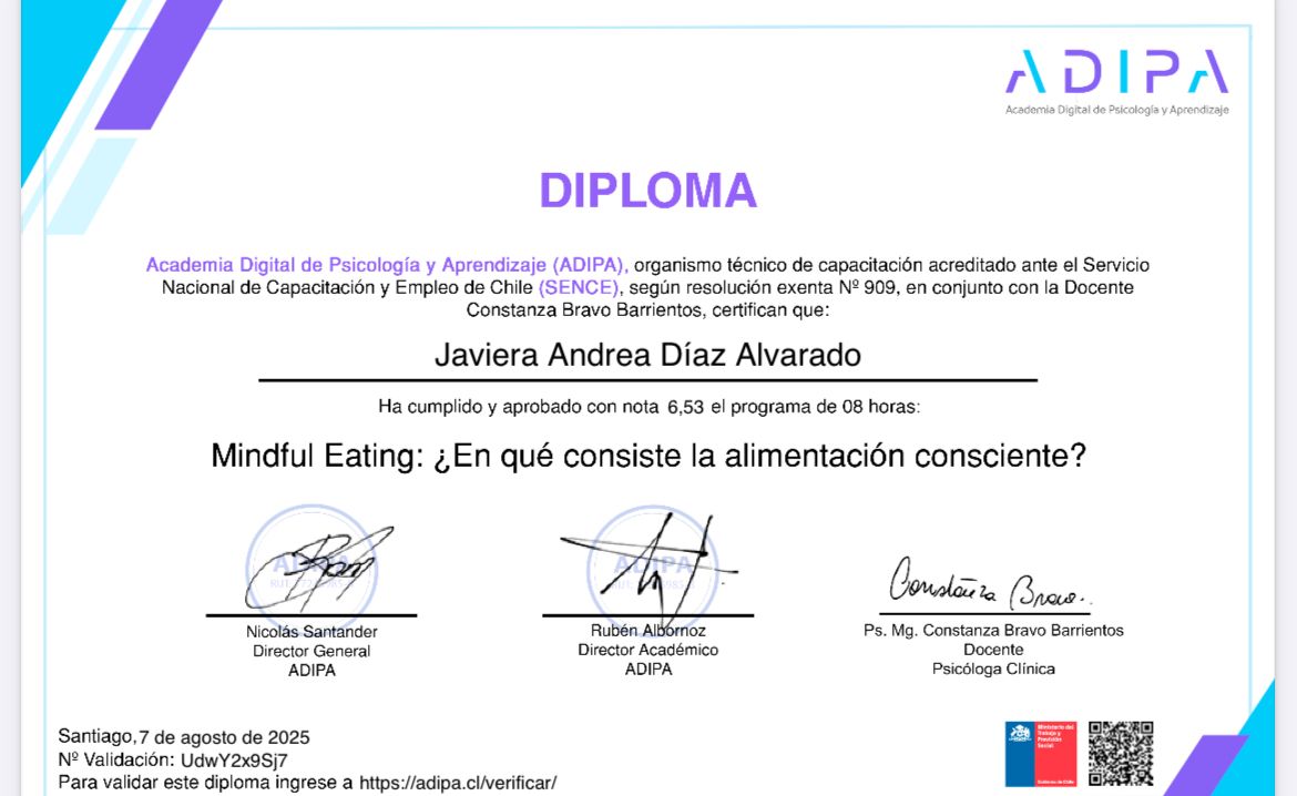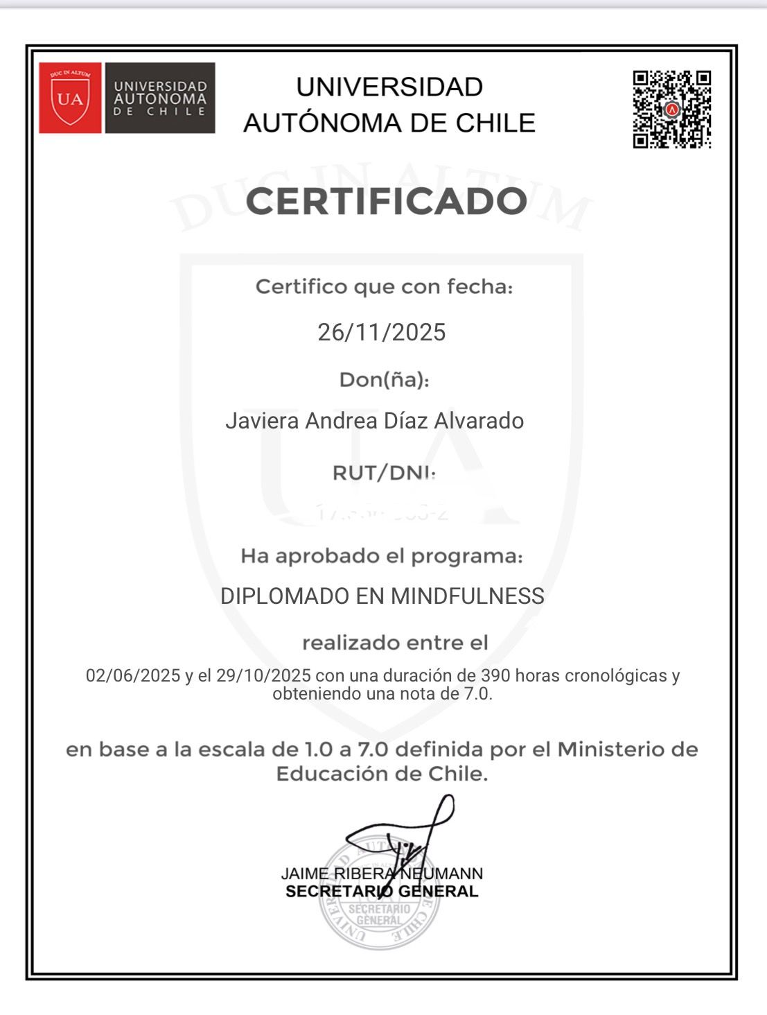 Mi formación: Estoy titulada en Psicología por la Universidad de Valparaíso y cuento con formación de posgrado en mindfulness aplicado a la salud, actualmente cursando un Máster en la Universidad Complutense de Madrid. Además, he realizado diplomados en mindfulness (Universidad Autónoma) e Intervenciones Terapéuticas (PUCV), así como formación en Terapia Centrada en la Compasión (CFT), complementando mi experiencia con diversos cursos de formación terapéutica.