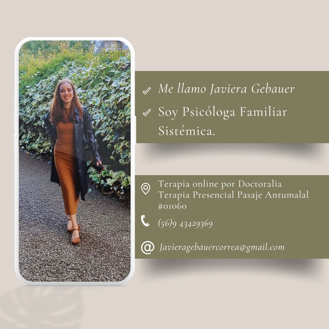 Hola! me llamo Javiera Gebauer, soy psicóloga con enfoque en terapia familiar sistémica, dedicada a acompañar a jóvenes, adultos y familias en la construcción de relaciones más sanas y significativas. Trabajo desde una mirada integral, considerando la importancia de los vínculos. Mi objetivo es brindar un espacio seguro, de confianza y escucha, donde puedas explorar tus experiencias, fortalecer recursos personales y encontrar nuevas formas de afrontar los desafíos.