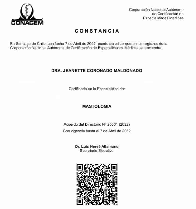 Hola, soy Jeanette Coronado M., cirujana y mastóloga. Atiendo a pacientes con patología benigna y maligna de mama. Será un gusto colaborar con tus consultas.